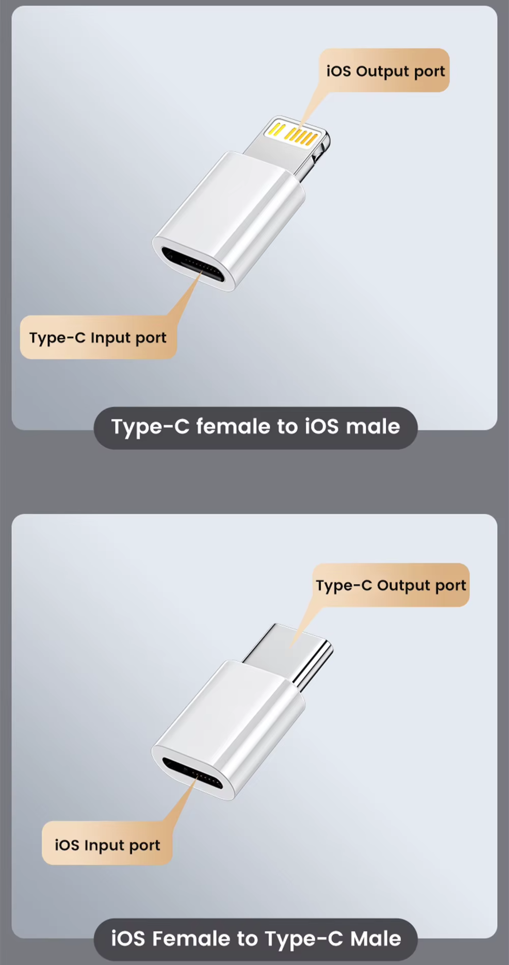 Tipo-C fêmea para iOS macho: Conecte cabos USB-C a dispositivos Apple com porta Lightning.