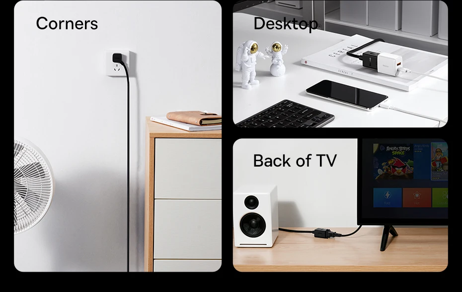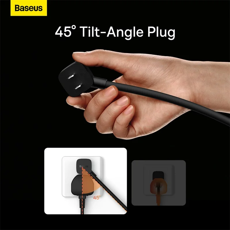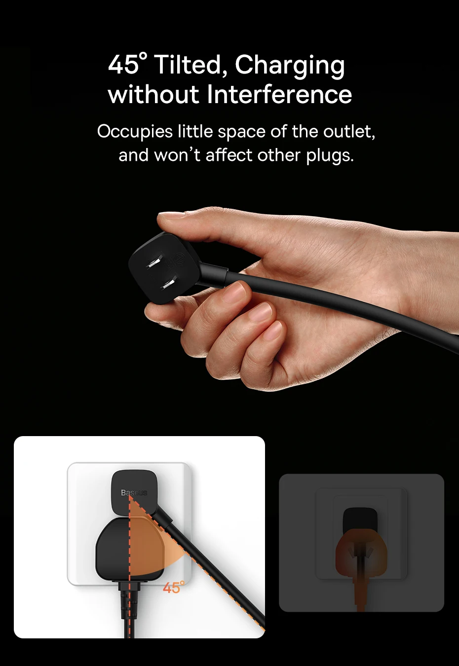 Inclinação de 45° do cabo: Ocupe um menor espaço na tomada com esta inclinação: