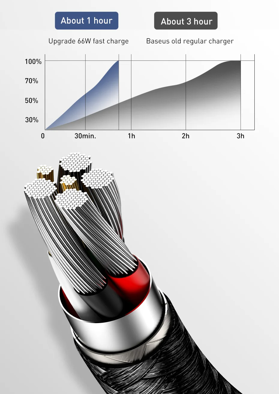 Carregamento 3x mais rápido: Com 6 fios de cobre, este cabo carrega até 3 vezes mais rápido que cabos comuns, levando apenas 1 hora para carga completa com 66W de potência: