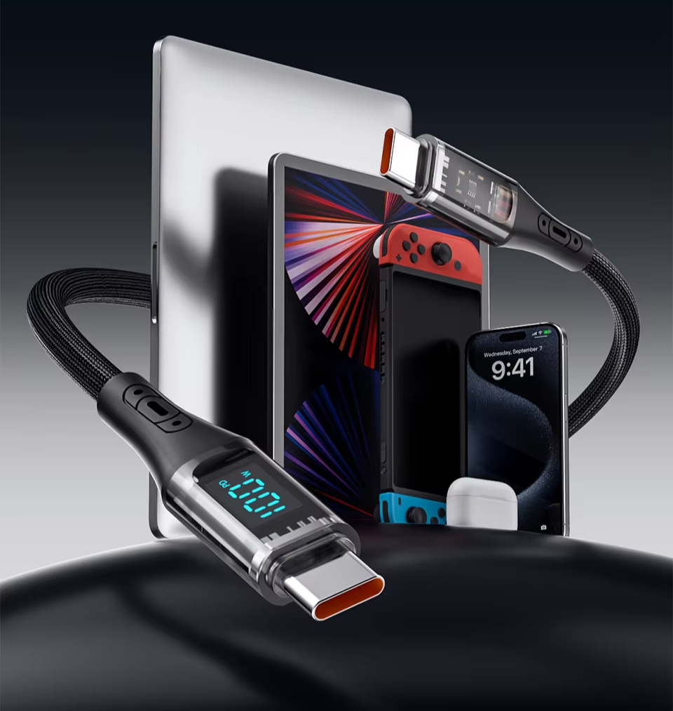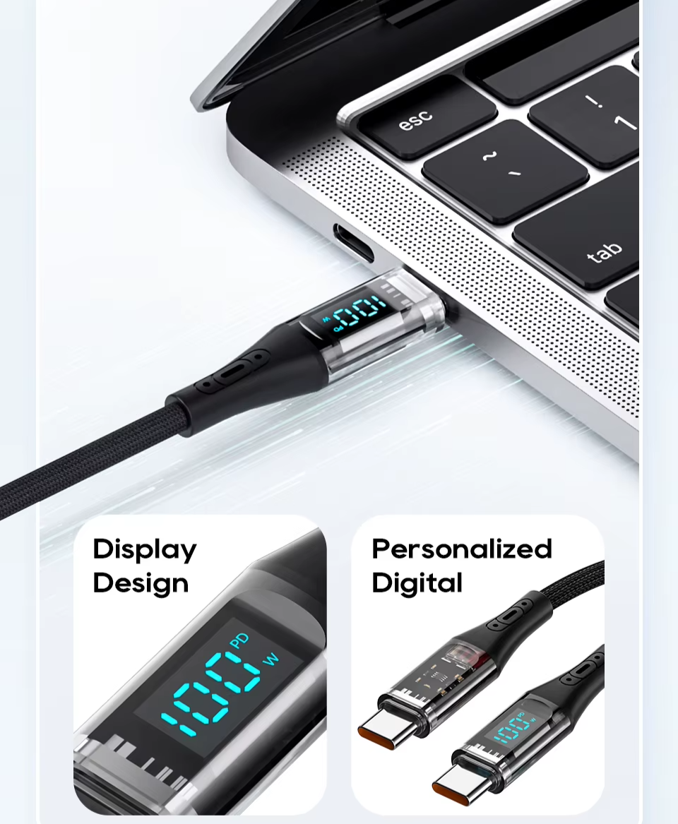 Cabo USB-C 100W Kuulaa com Display LED: Carregamento ultrarrápido com até 100W de potência, visor digital para acompanhar a carga em tempo real e chip E-Marker para segurança: