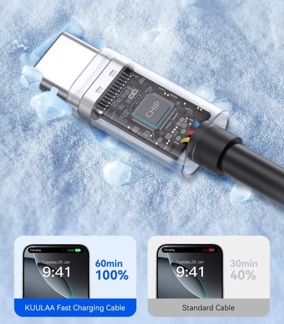 Chip Inteligente de Controle de Temperatura: O cabo Kuulaa conta com um chip inteligente que regula a temperatura durante o carregamento, garantindo maior segurança e eficiência: