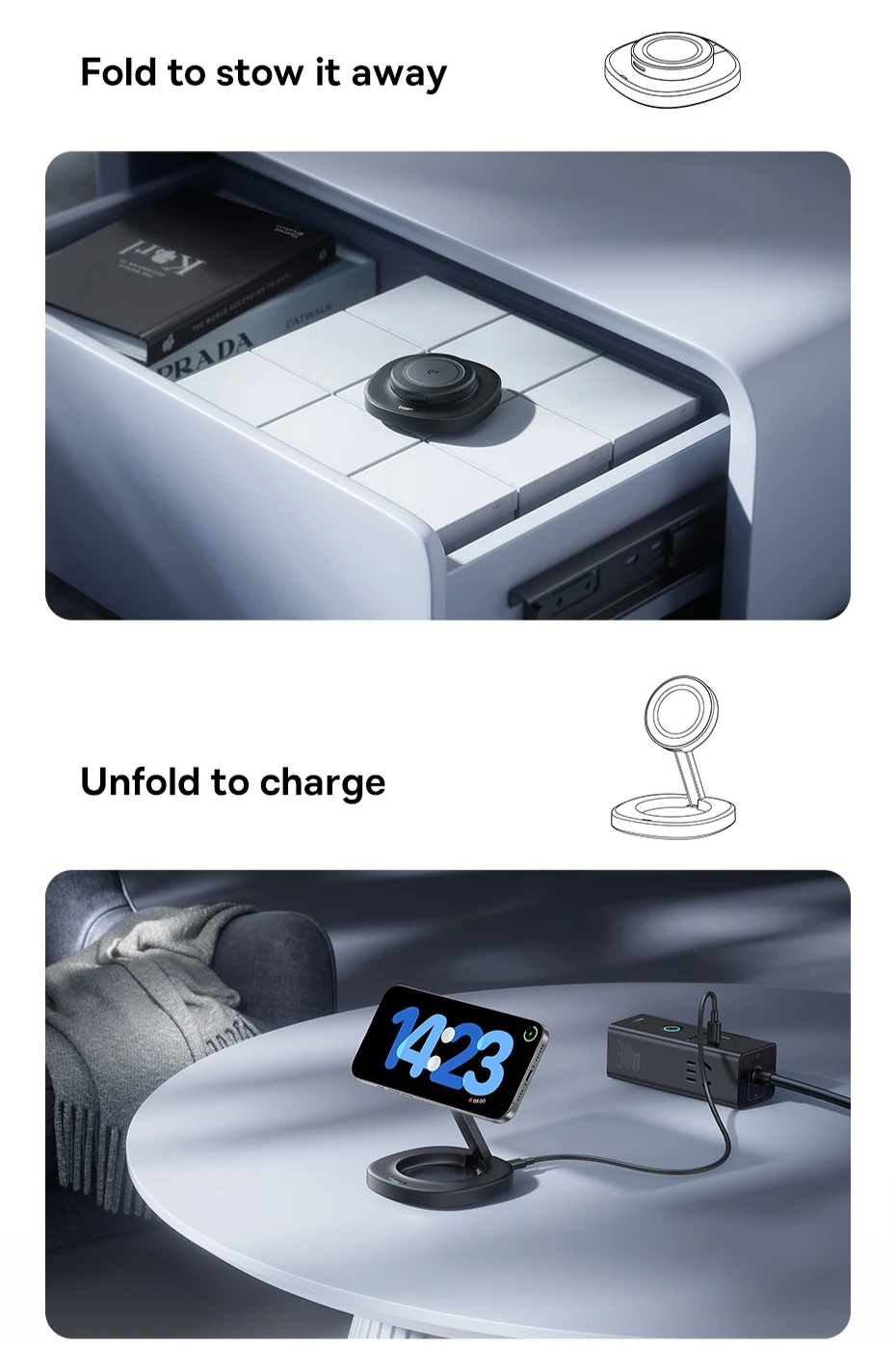 Design dobrável e portátil: Facilita o transporte e economiza espaço, podendo ser guardado ou usado para carregar em segundos: