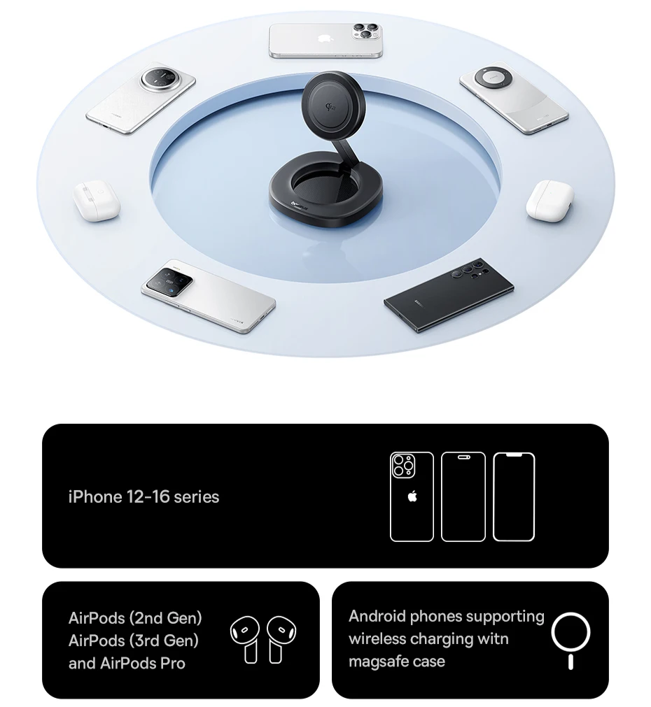 Compatibilidade Universal: Funciona com iPhones (série 12 a 16), AirPods (2ª e 3ª geração e Pro) e smartphones Android com capa compatível MagSafe: