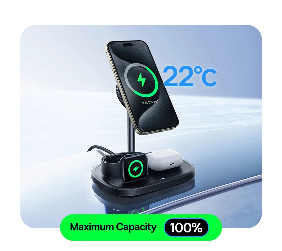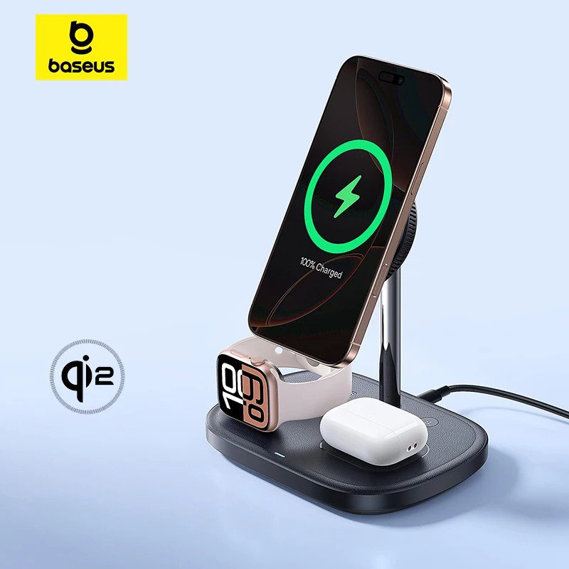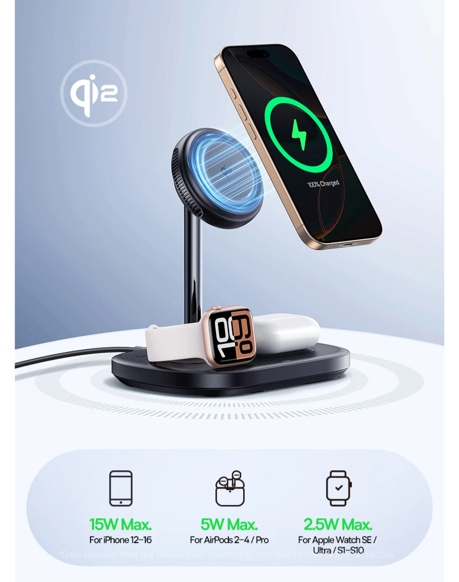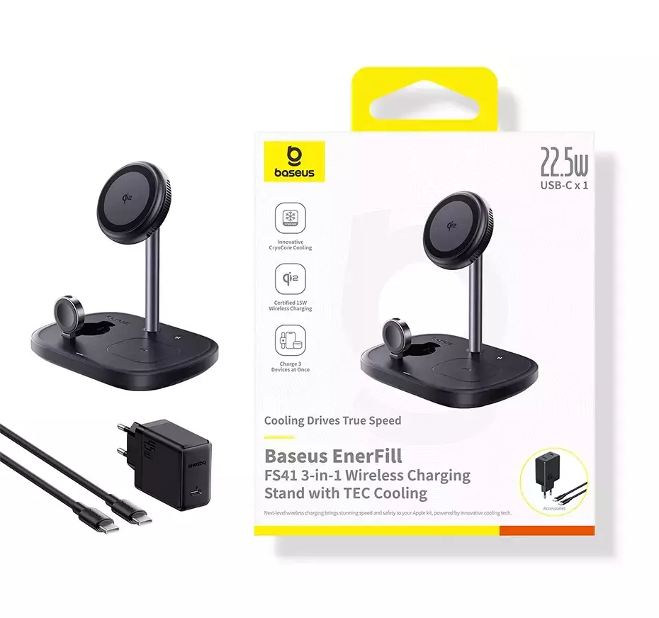 Carregamento Rápido e Eficiente: Baseus EnerFill 3 em 1 com resfriamento CryoCore e potência de 15W oferece carregamento rápido e seguro para celular, smartwatch e fones ao mesmo tempo: