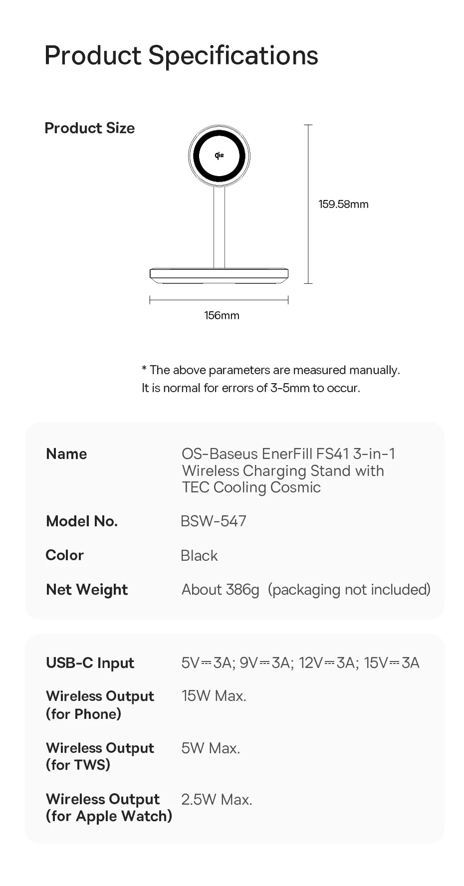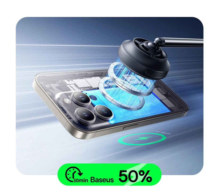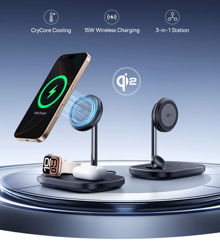 Carregamento Rápido e Eficiente: Baseus EnerFill 3 em 1 com resfriamento CryoCore e potência de 15W oferece carregamento rápido e seguro para celular, smartwatch e fones ao mesmo tempo: