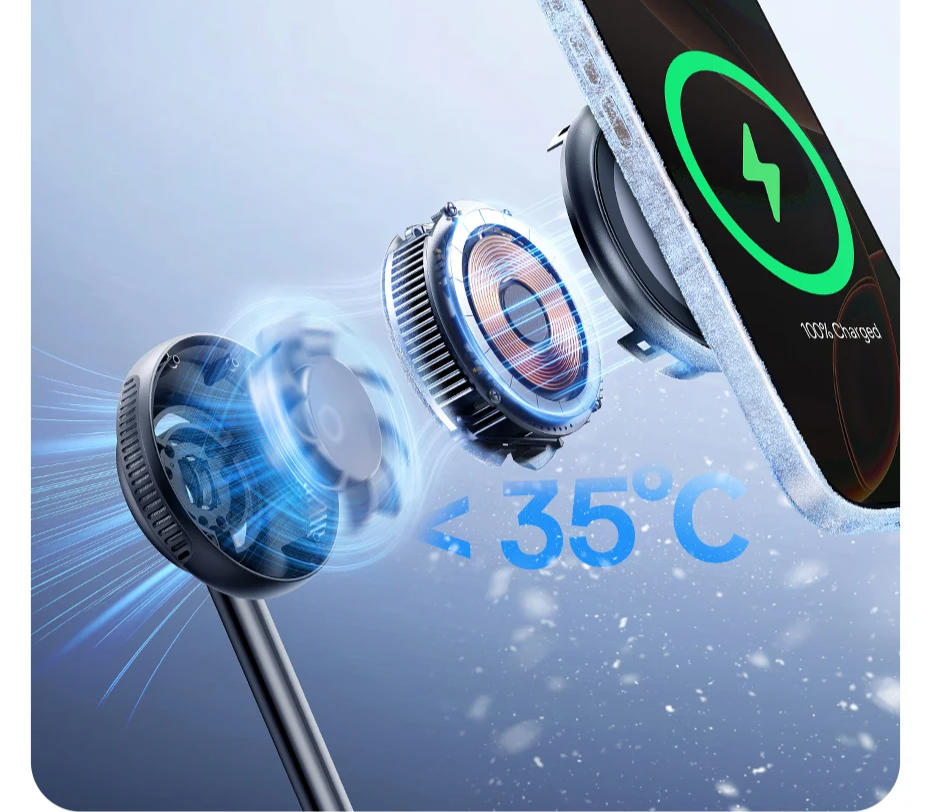 Temperatura Controlada: Com tecnologia CryoCore, o carregador mantém o aparelho abaixo de 35 °C, absorvendo e dissipando o calor de forma eficiente: