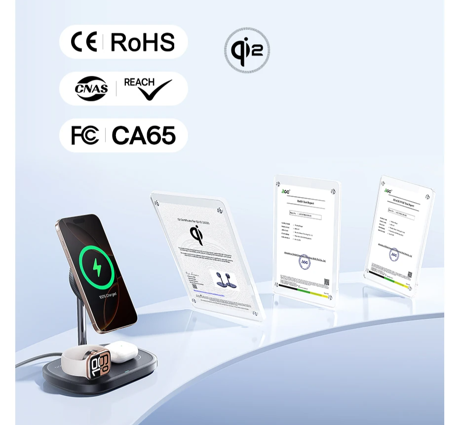 Certificações Oficiais, Garantia de Qualidade: O carregador possui certificações CE, RoHS, FCC, CA65, REACH e Qi2, garantindo segurança, desempenho e conformidade com os mais altos padrões internacionais:
