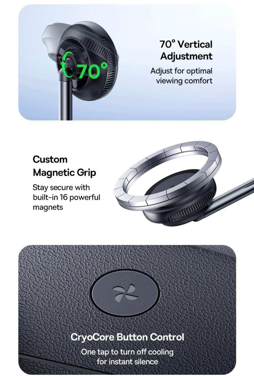 Ajuste Inteligente e Fixação Segura: Com inclinação de 70° para melhor visualização, 16 ímãs potentes para fixação firme e botão CryoCore para controle rápido do resfriamento: