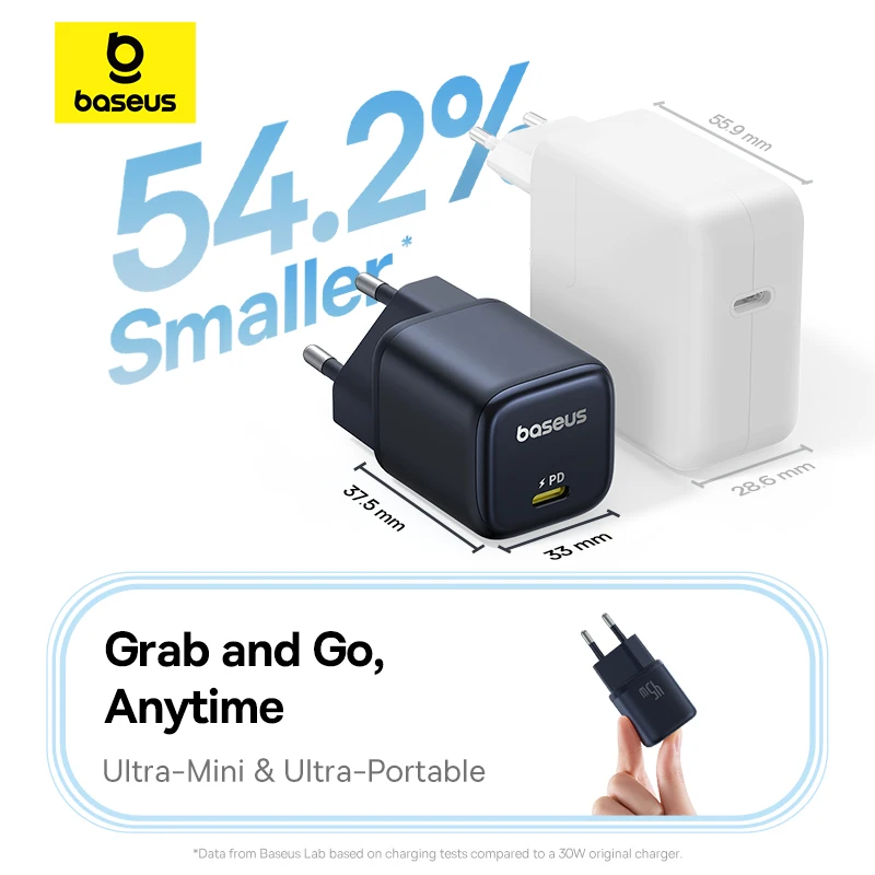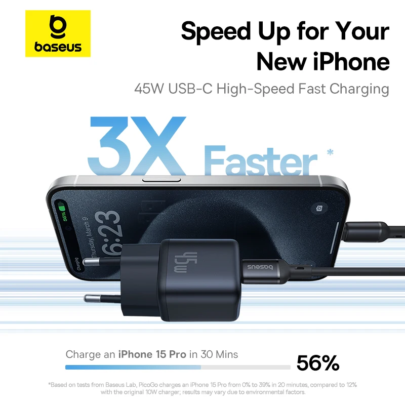 Carregador Baseus PicoGo 45W GaN5 Pro: Ultracompacto e potente, com carregamento rápido de até 45W, alta eficiência energética (93%) e múltiplas proteções. Compatível com celulares, tablets, notebooks e acessórios via USB-C:
