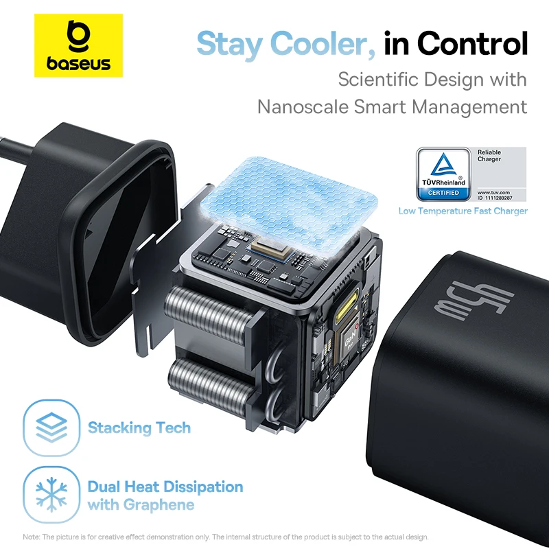 Tecnologia Avançada de Resfriamento: Certificado pela TÜV Rheinland, o carregador oferece carregamento rápido com baixa temperatura graças à sua estrutura interna otimizada: