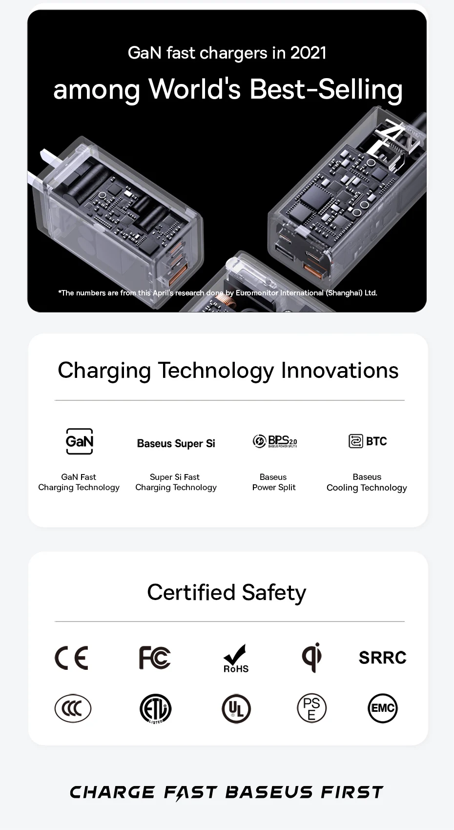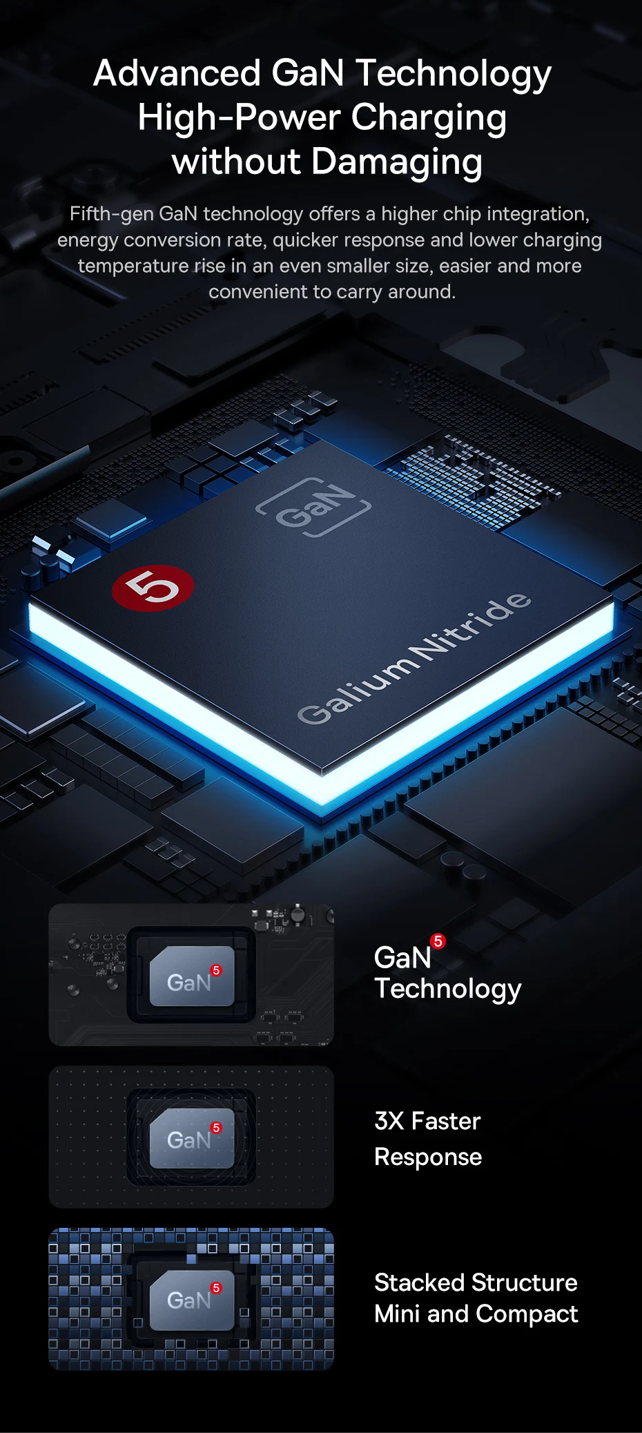 Tecnologia GaN5: Quinta geração da tecnologia que oferece melhor taxa de conversação de energia, resposta rápida e menor temperatura de carregamento:
