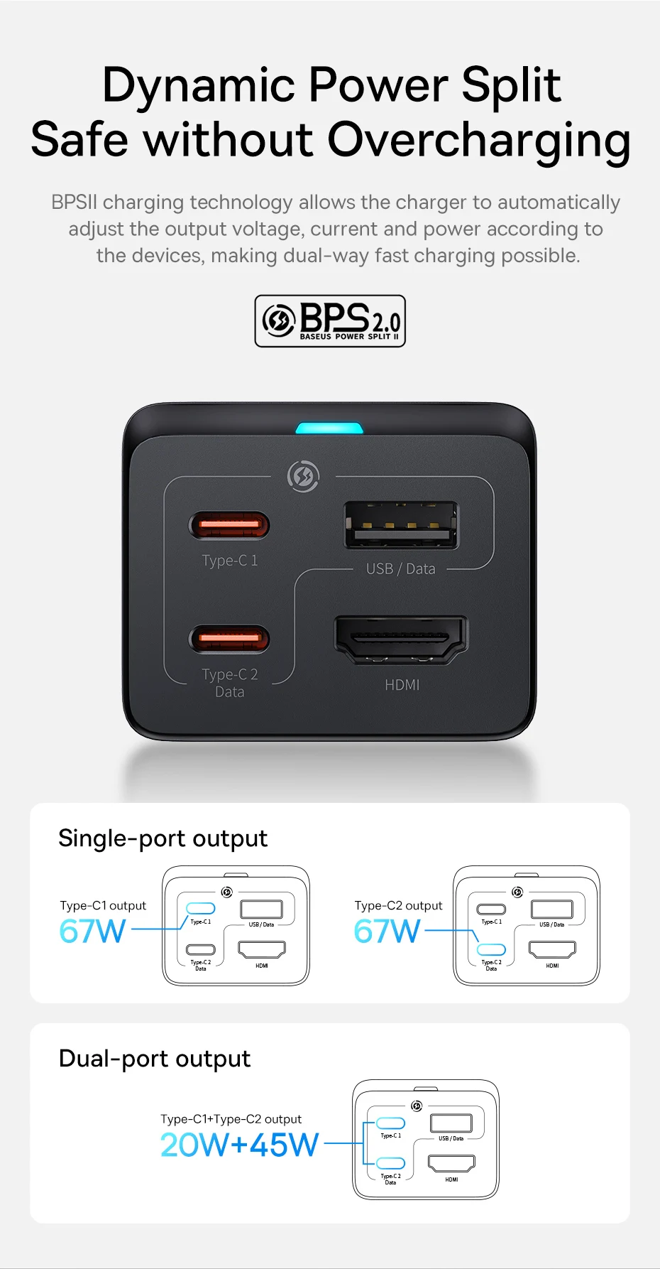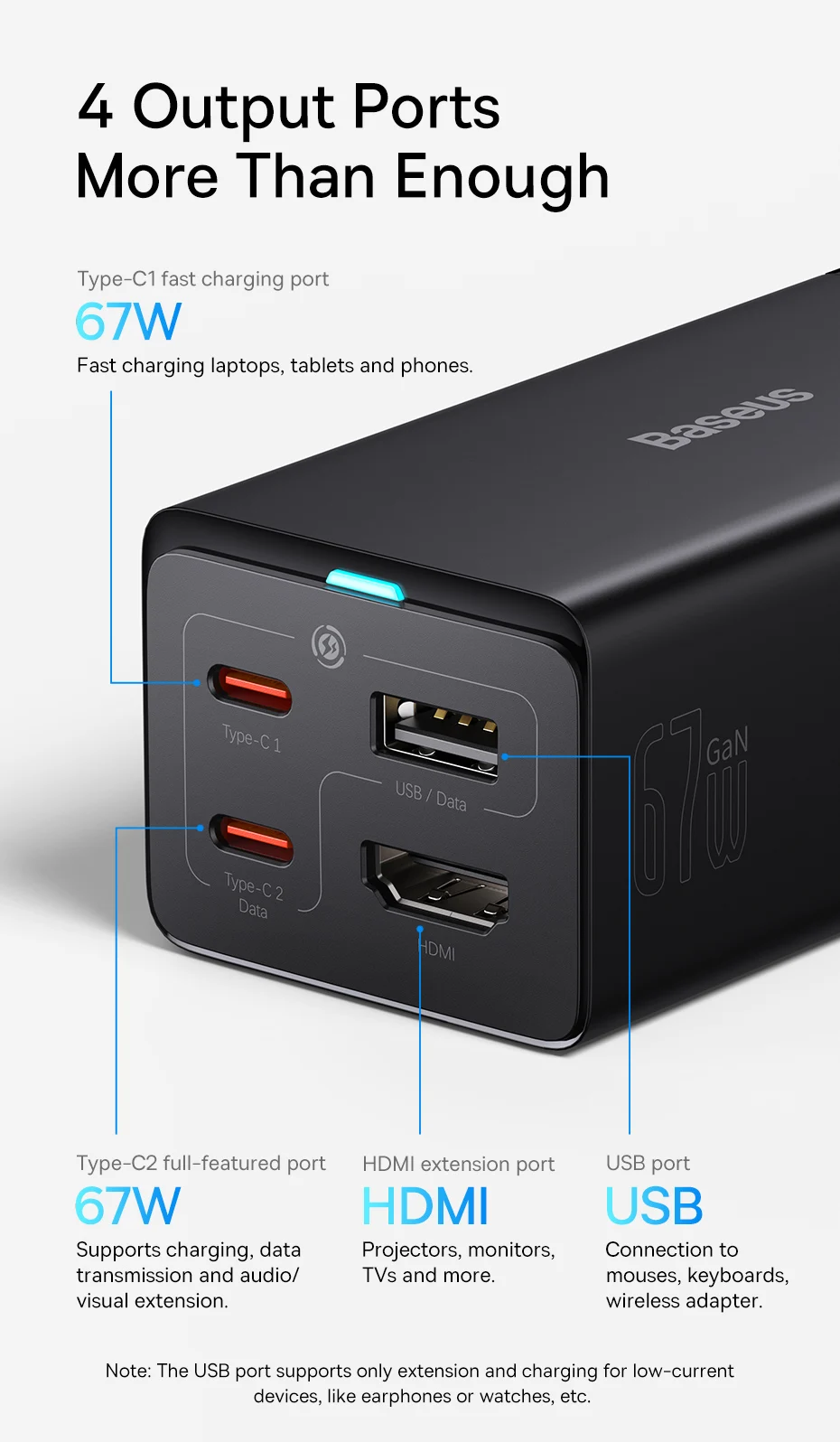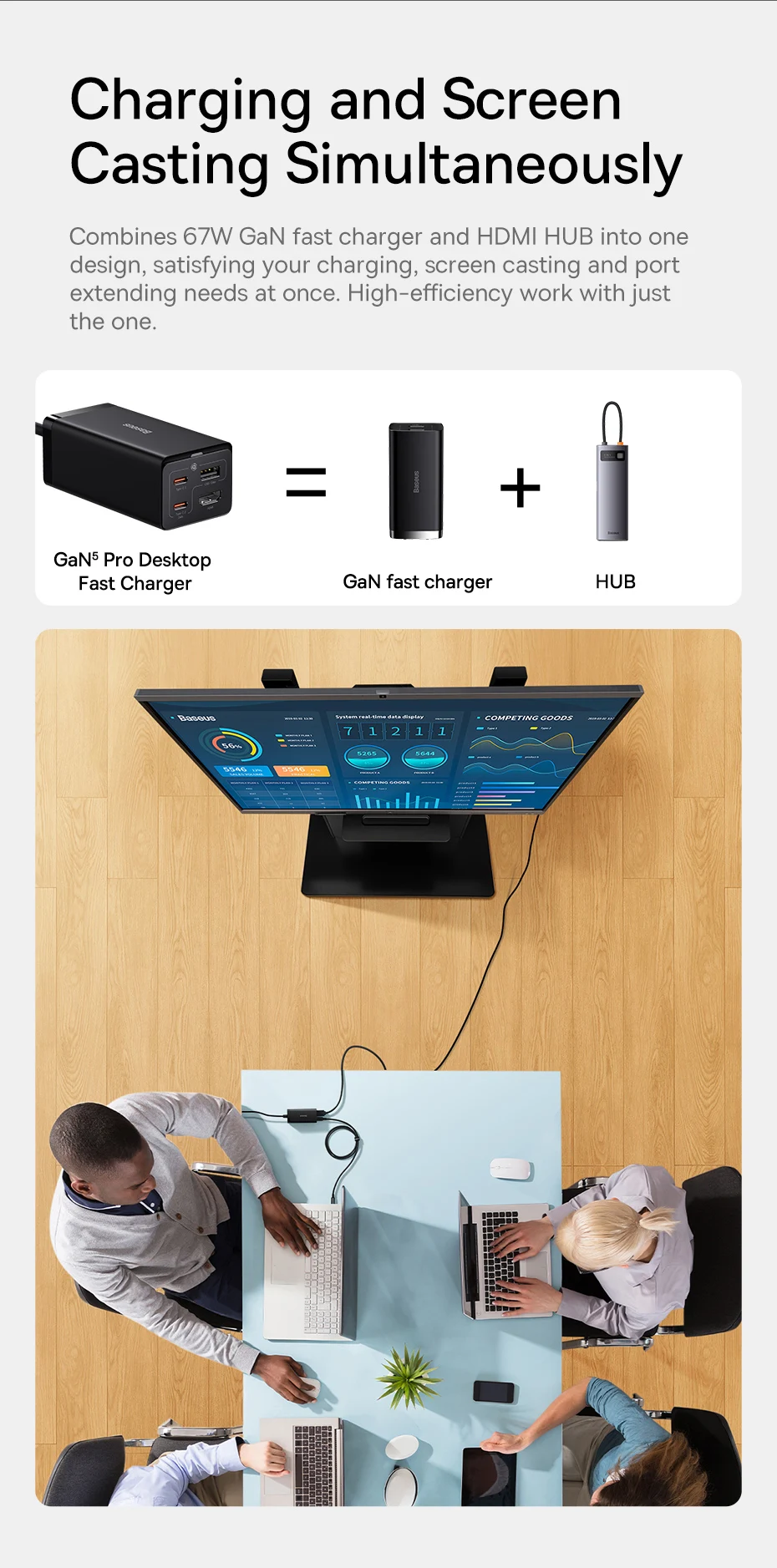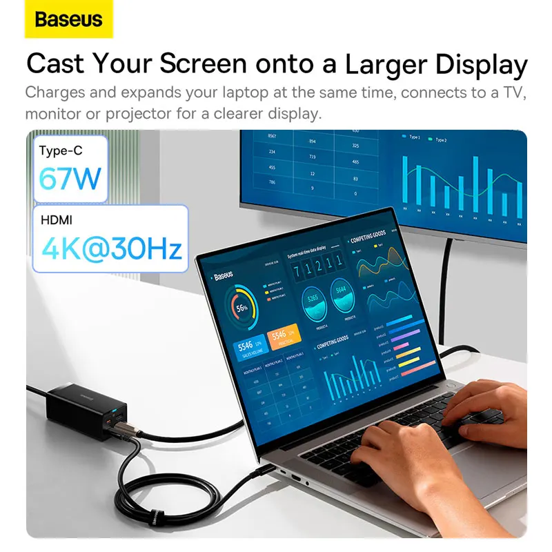 Telas Simultâneas: Esse produto combina o carregador rápido GaN 67W e o HUB HDMI em um único produto, trazendo para você transmissão de tela e extensão de porta ao mesmo tempo, com alta eficiência: