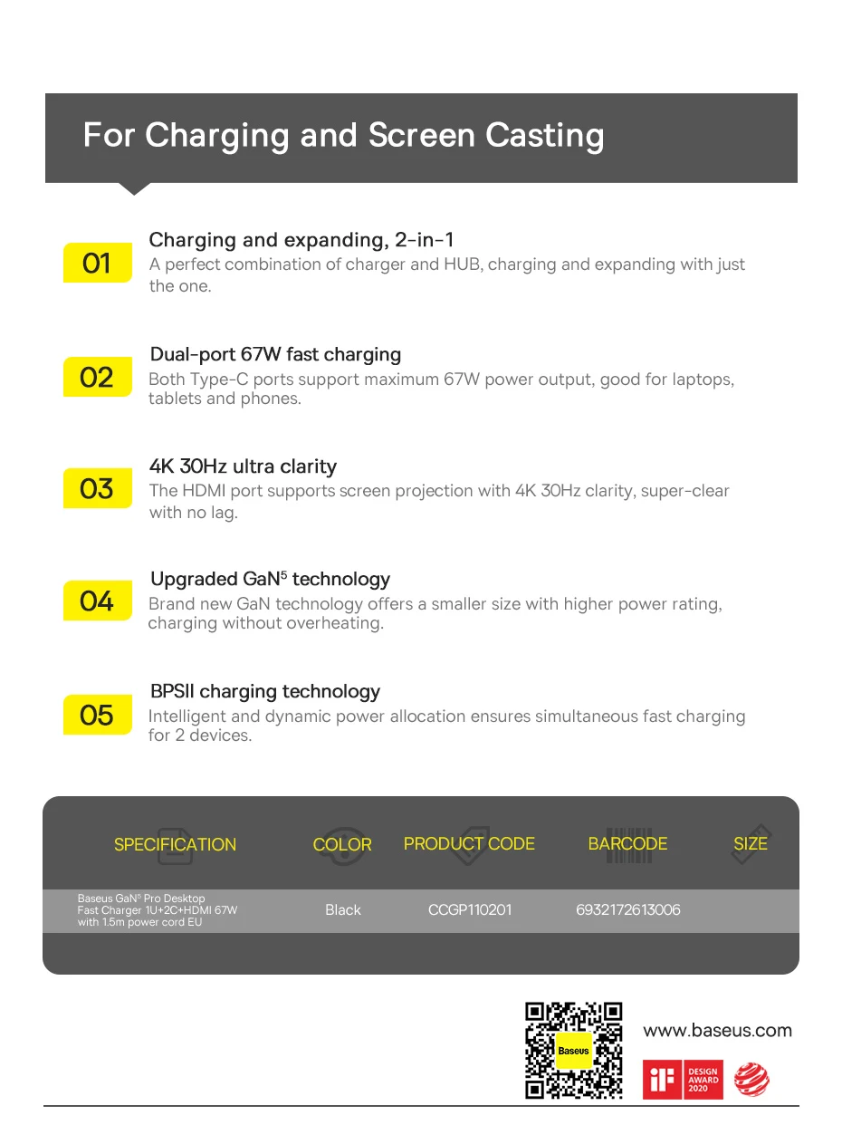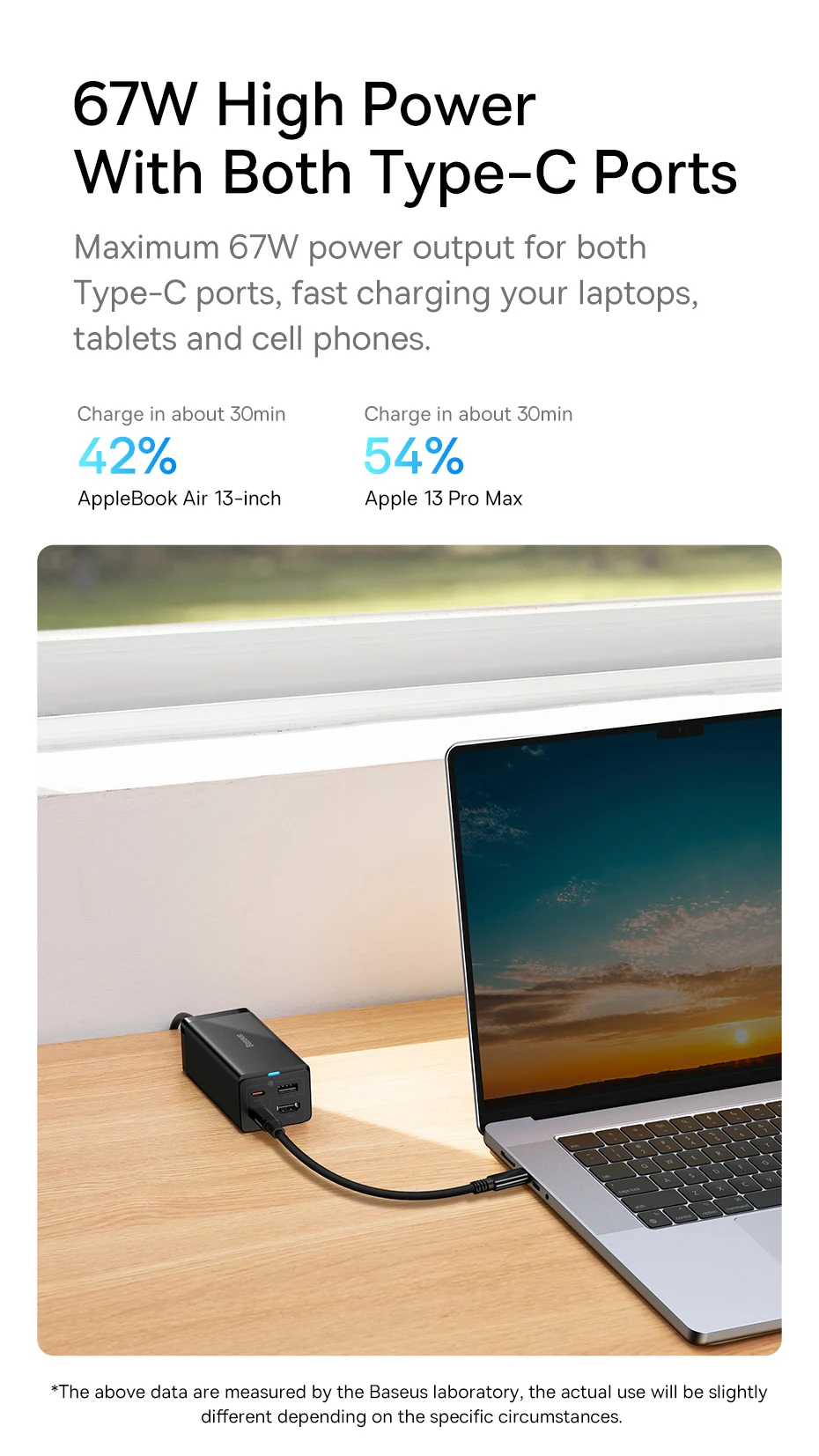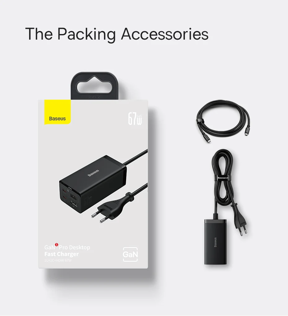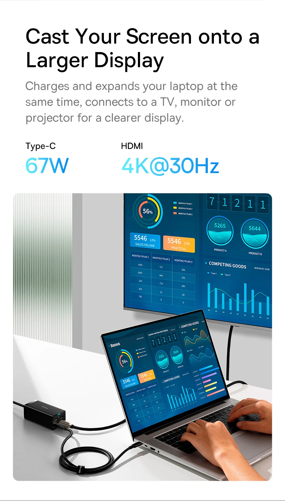 Telas Simultâneas: Esse produto combina o carregador rápido GaN 67W e o HUB HDMI em um único produto, trazendo para você transmissão de tela e extensão de porta ao mesmo tempo, com alta eficiência: