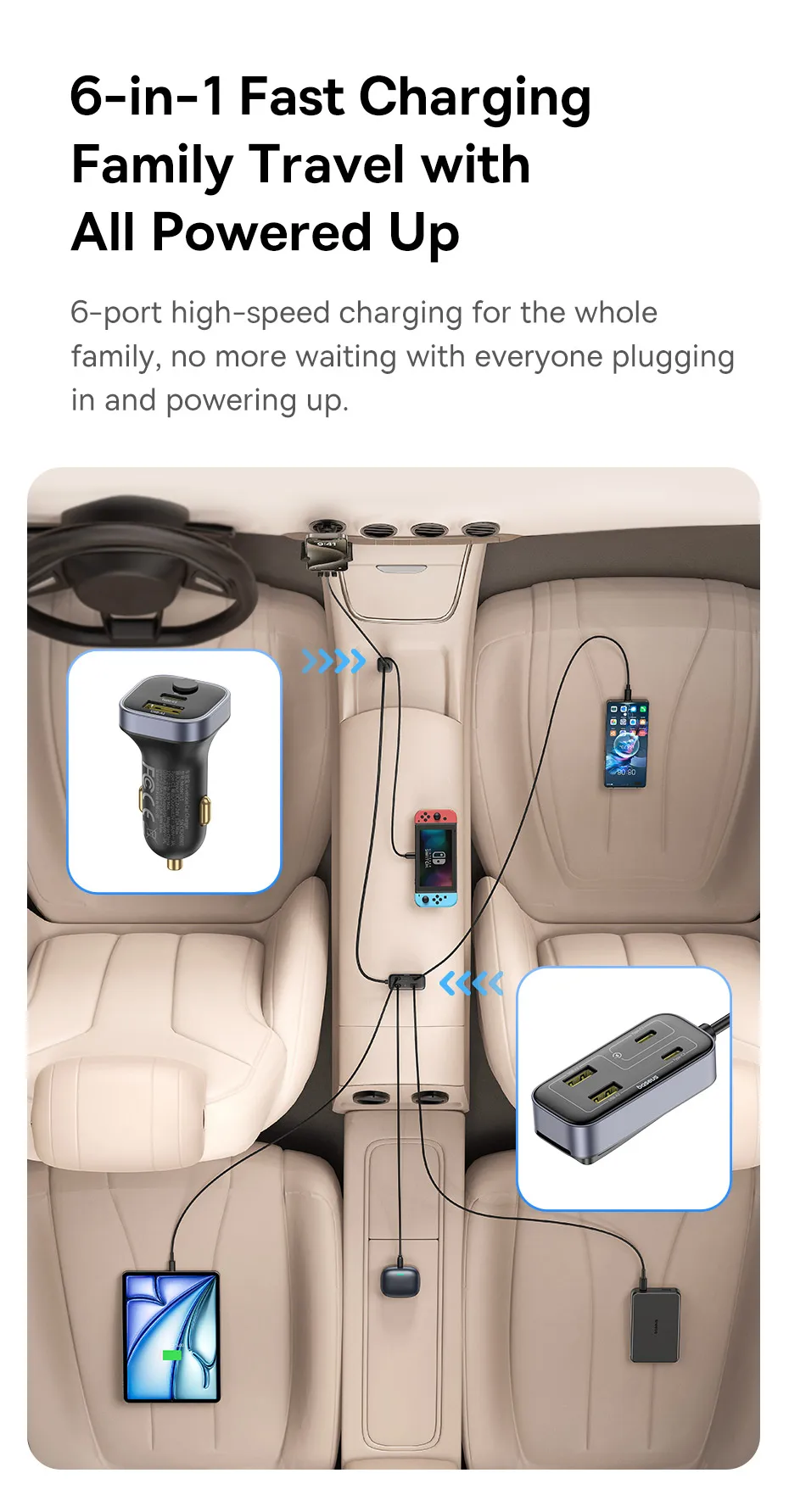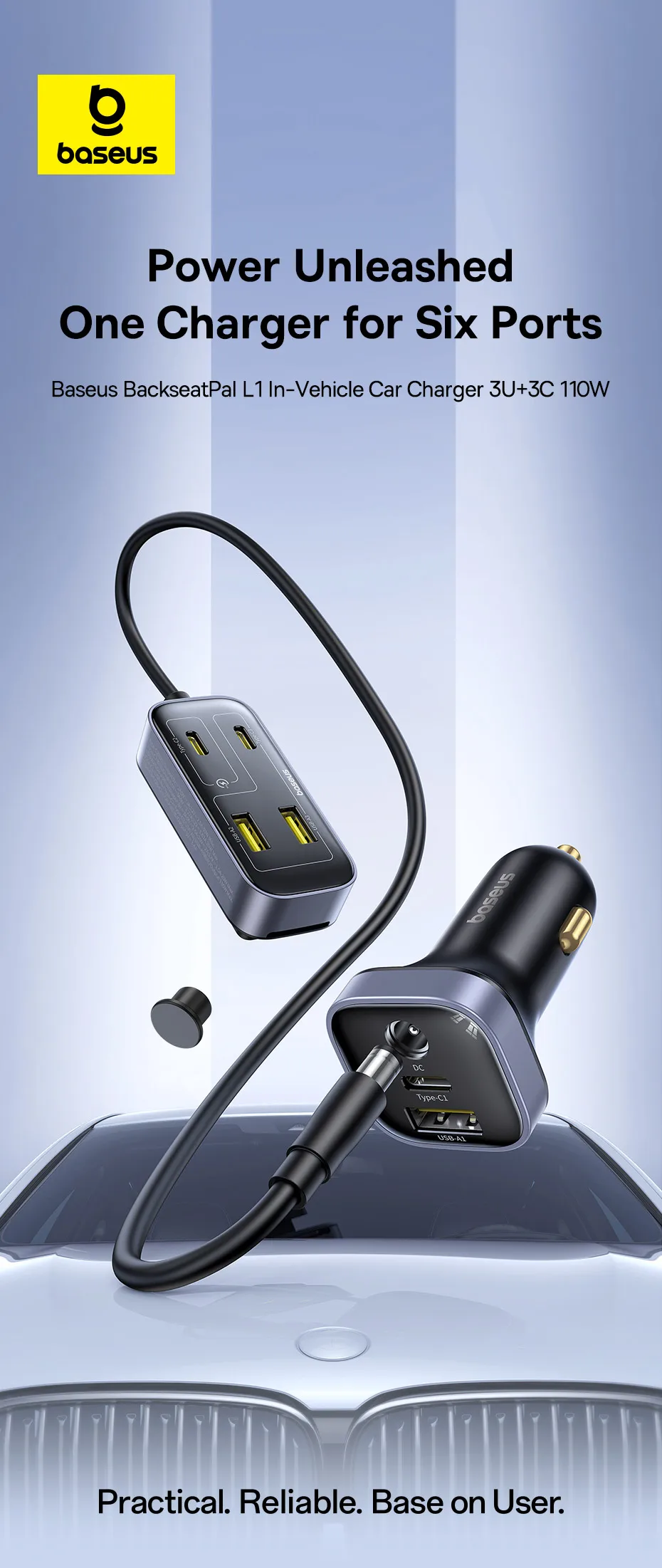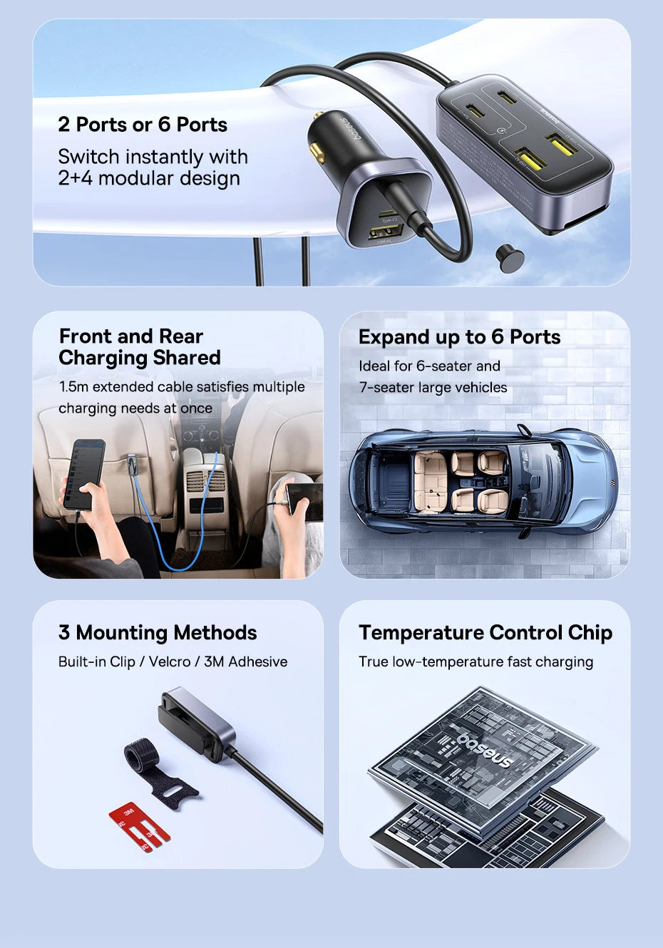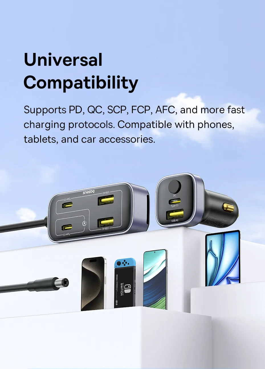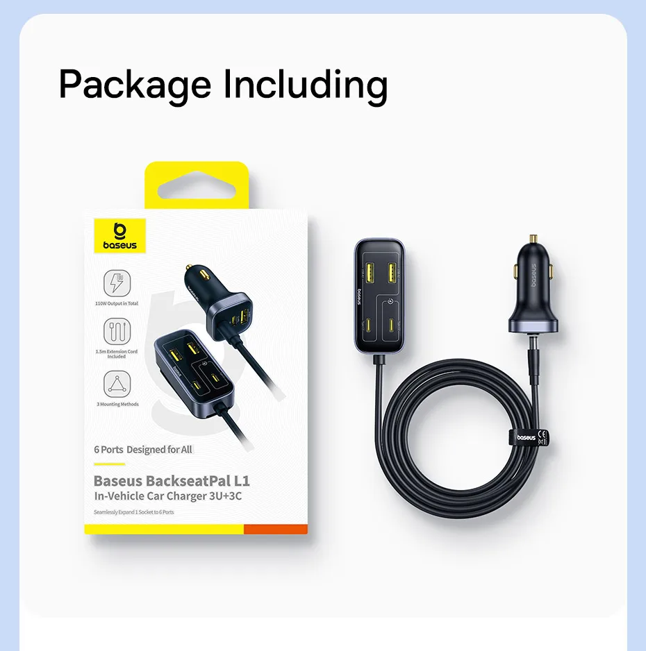 Carregador Veicular 110W com Cabo Extensor 6 Portas