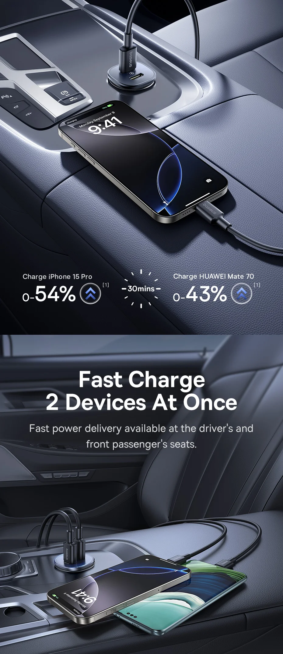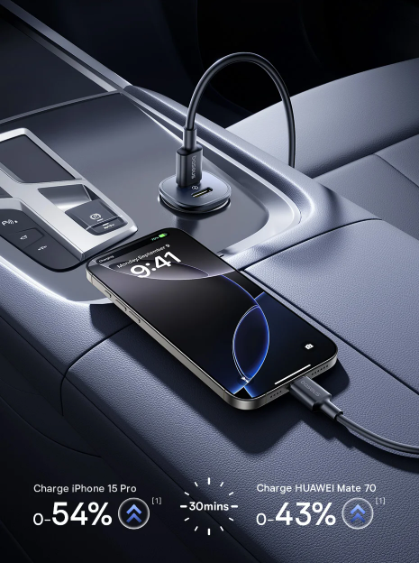 Carregamento Rápido 30W PD: Carregue iPhone ou Android rapidamente no carro, atingindo 54% em 30 min no iPhone 15 Pro: