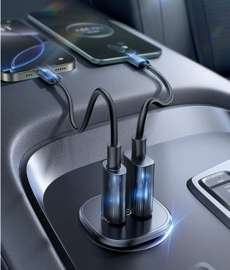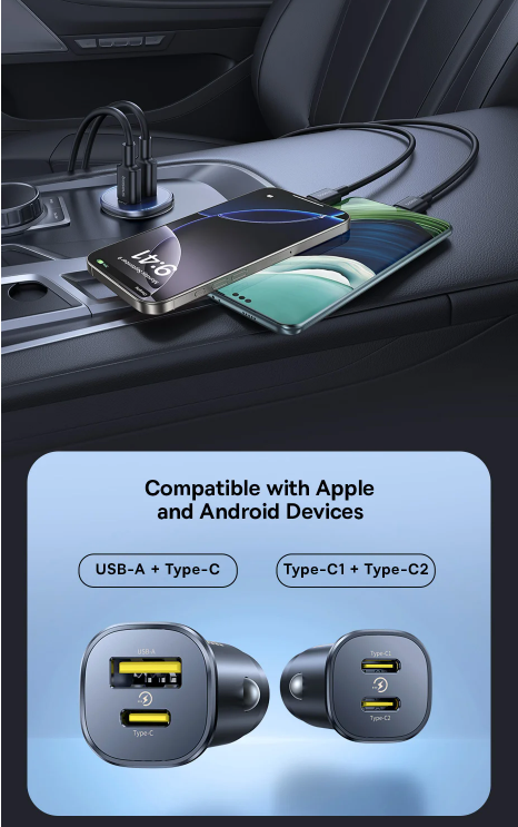 Carregue 2 Dispositivos ao Mesmo Tempo: Carregamento rápido simultâneo para motorista e passageiro, compatível com dispositivos Apple e Android via USB-A e USB-C: