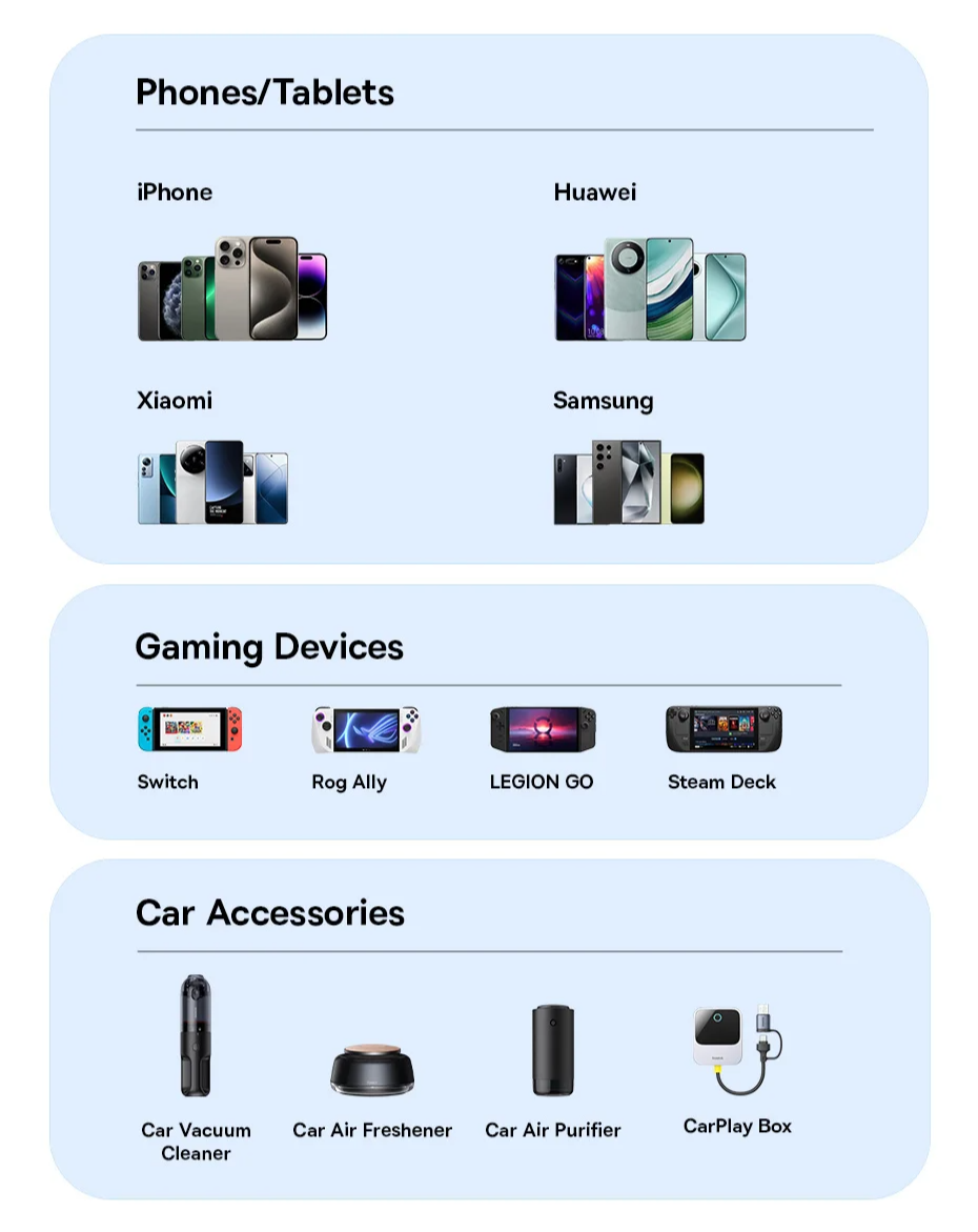 Compatível com Múltiplos Protocolos de Carregamento Rápido: Compatível com PD, QC, FCP e AFC para carregar iPhone, Huawei, Xiaomi, Samsung, dispositivos gamers (Switch, Rog Ally, Legion GO, Steam Deck) e acessórios automotivos:
