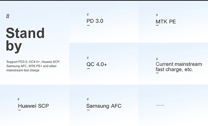 Compatível com Vários Protocolos de Carregamento Rápido: PD3.0, QC4.0+, Huawei SCP, Samsung SFC, MTK PE+ e etc: