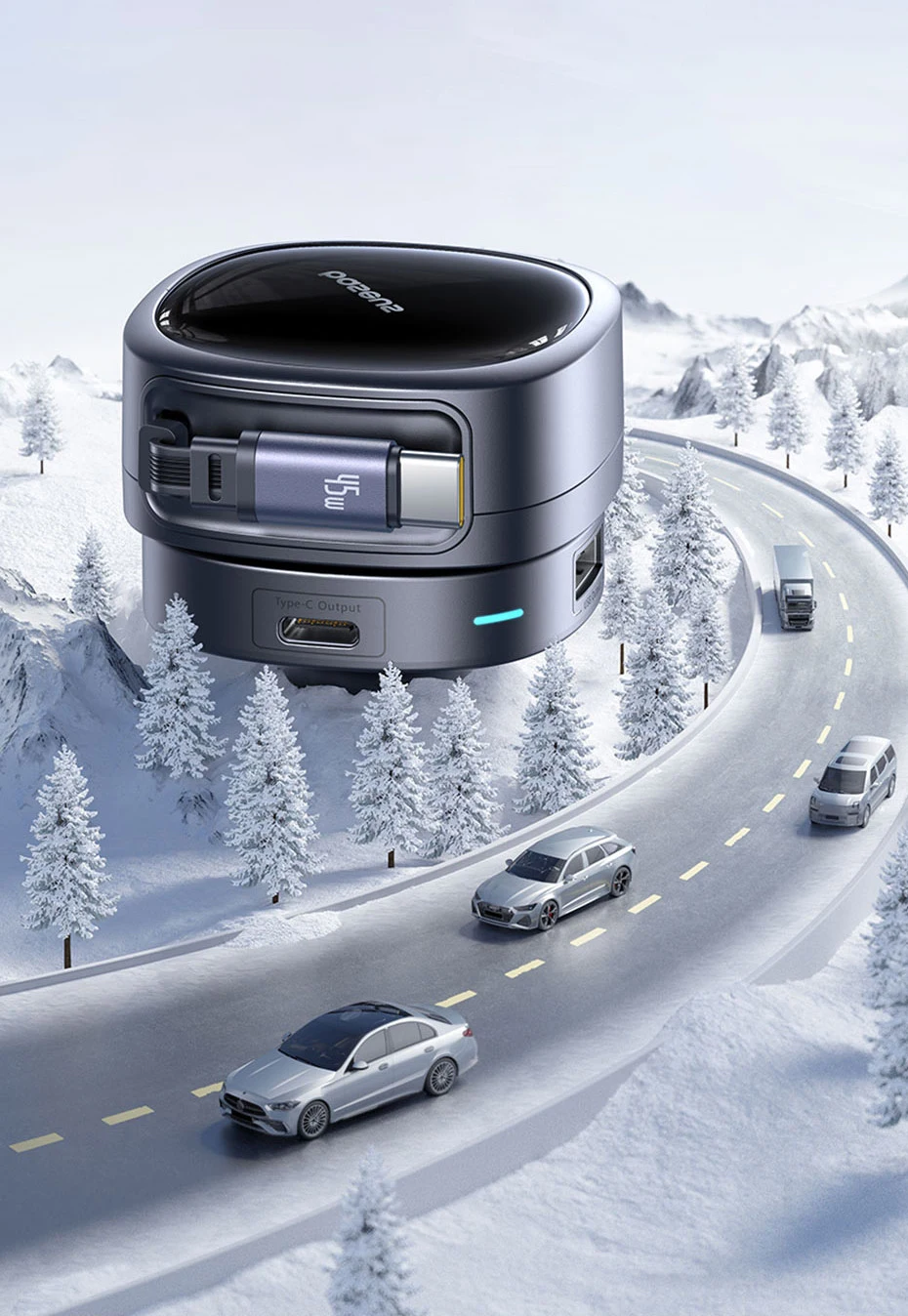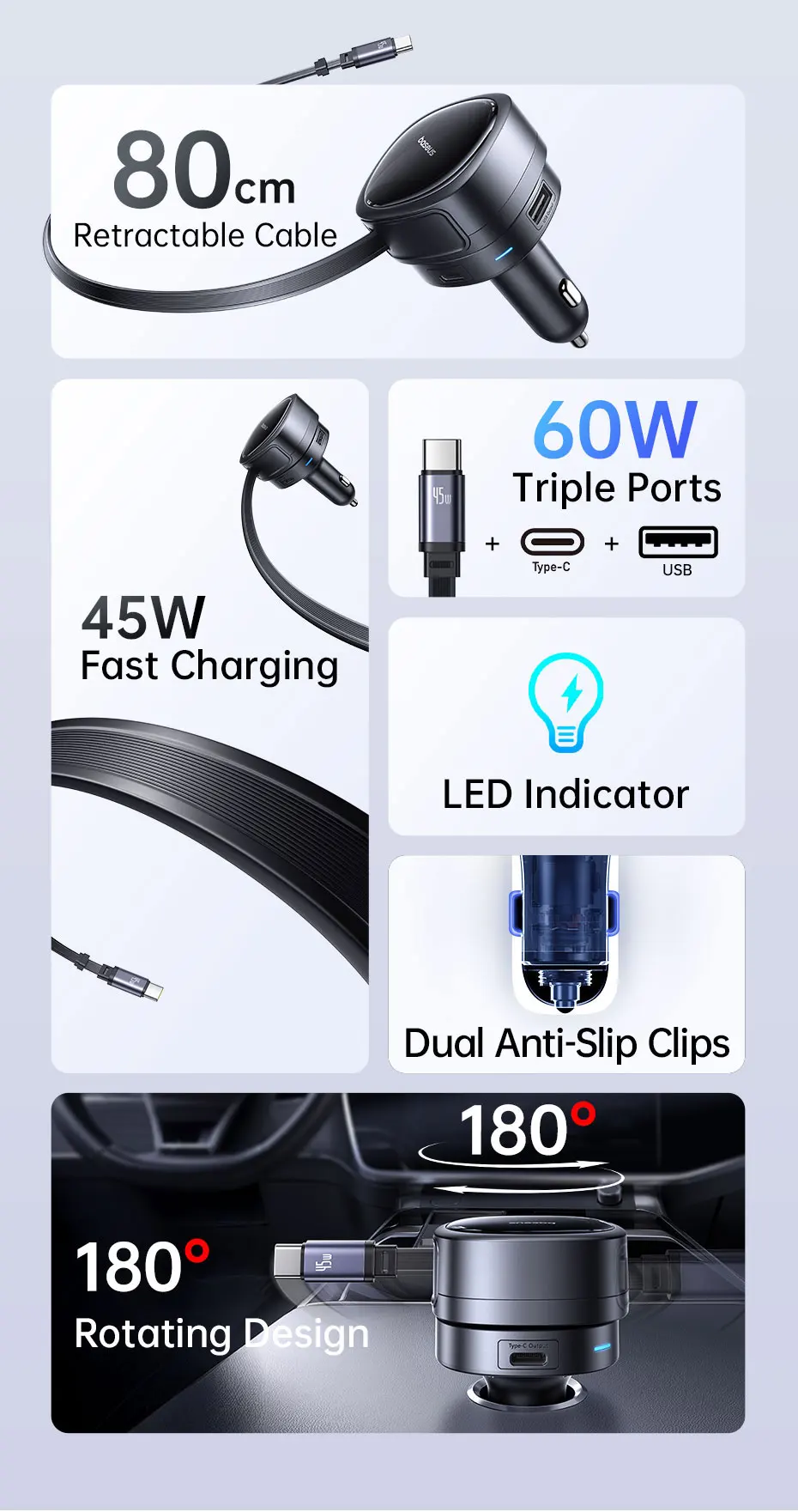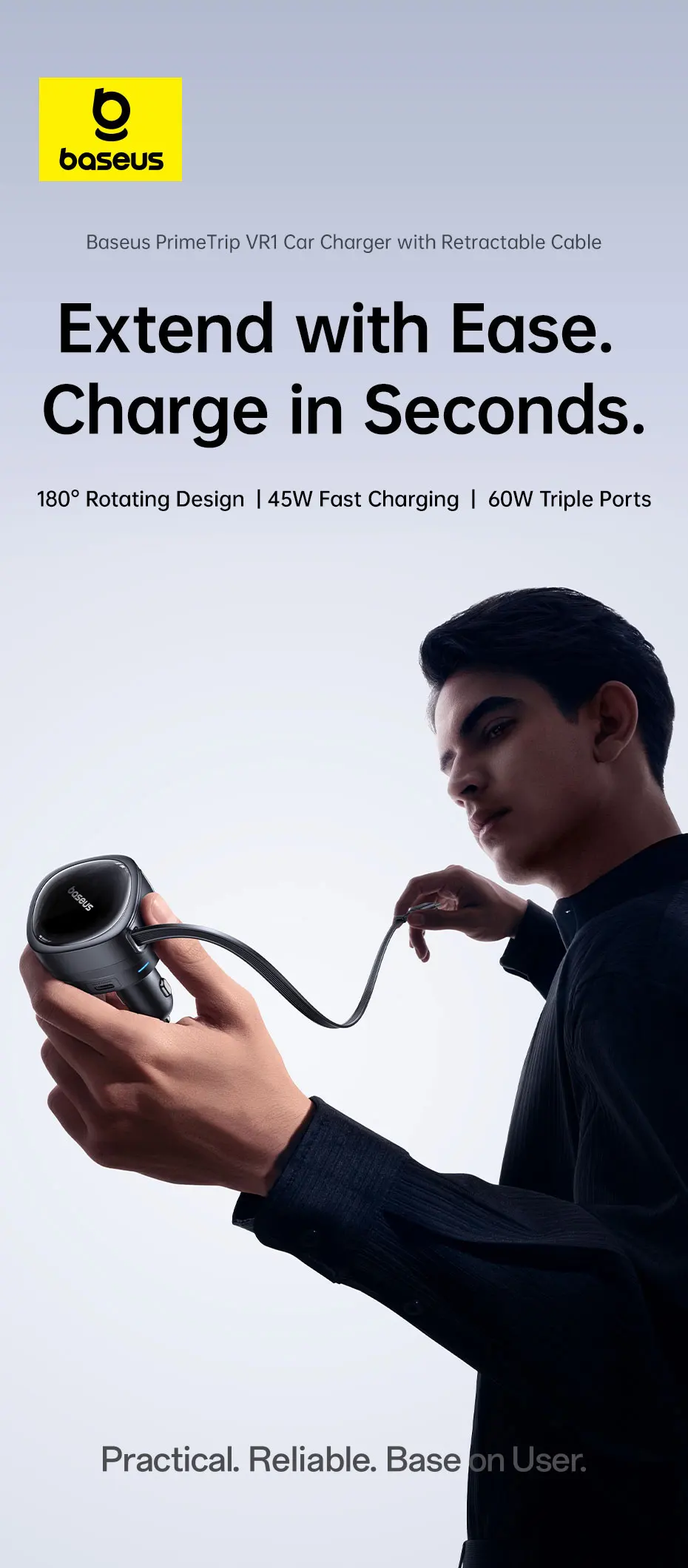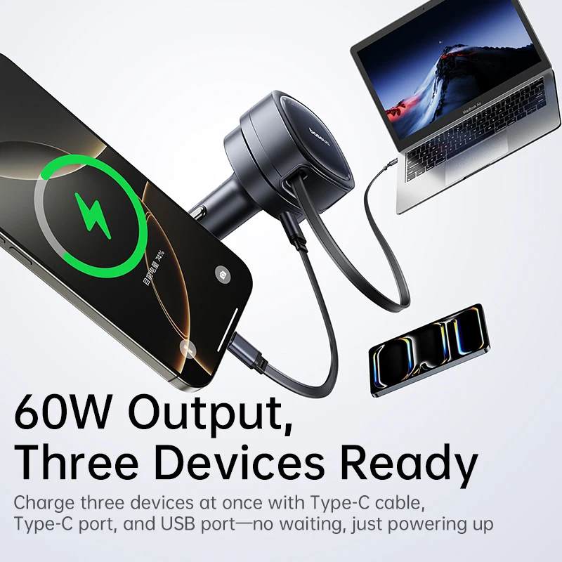 Carregue em segundos com praticidade: Design retrátil com rotação de 180°, até 60W de potência em 3 portas. Compacto, eficiente e pronto para qualquer viagem: