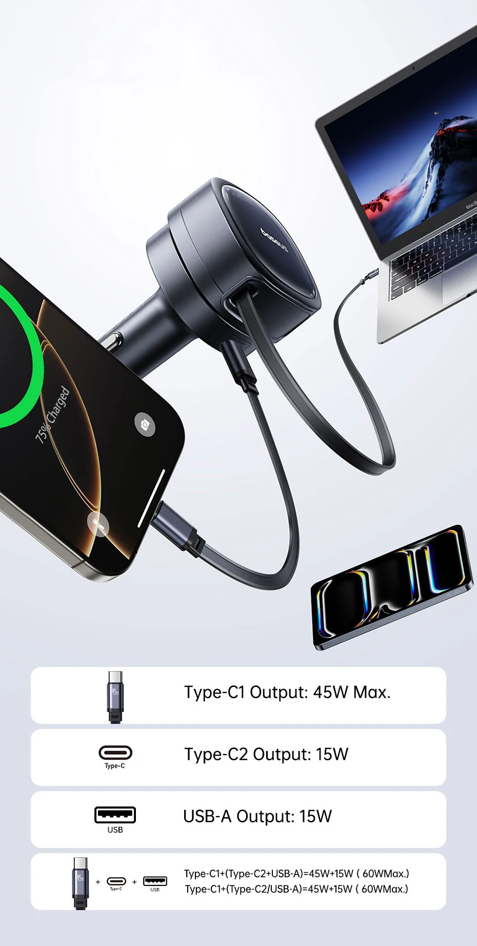 60W de Potência Total: Até 3 dispositivos podem ser carregados ao mesmo tempo: