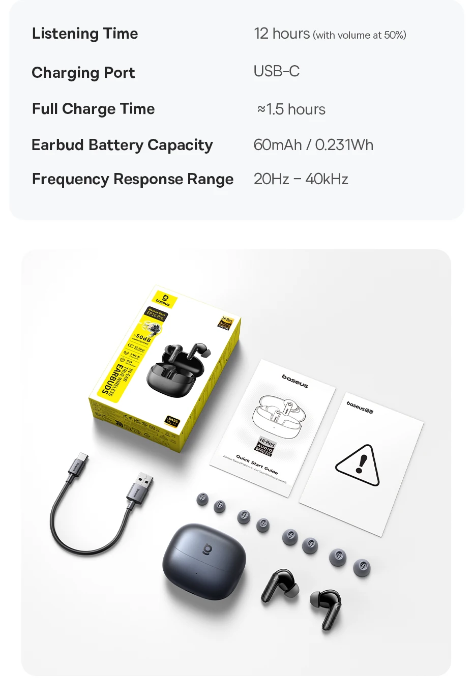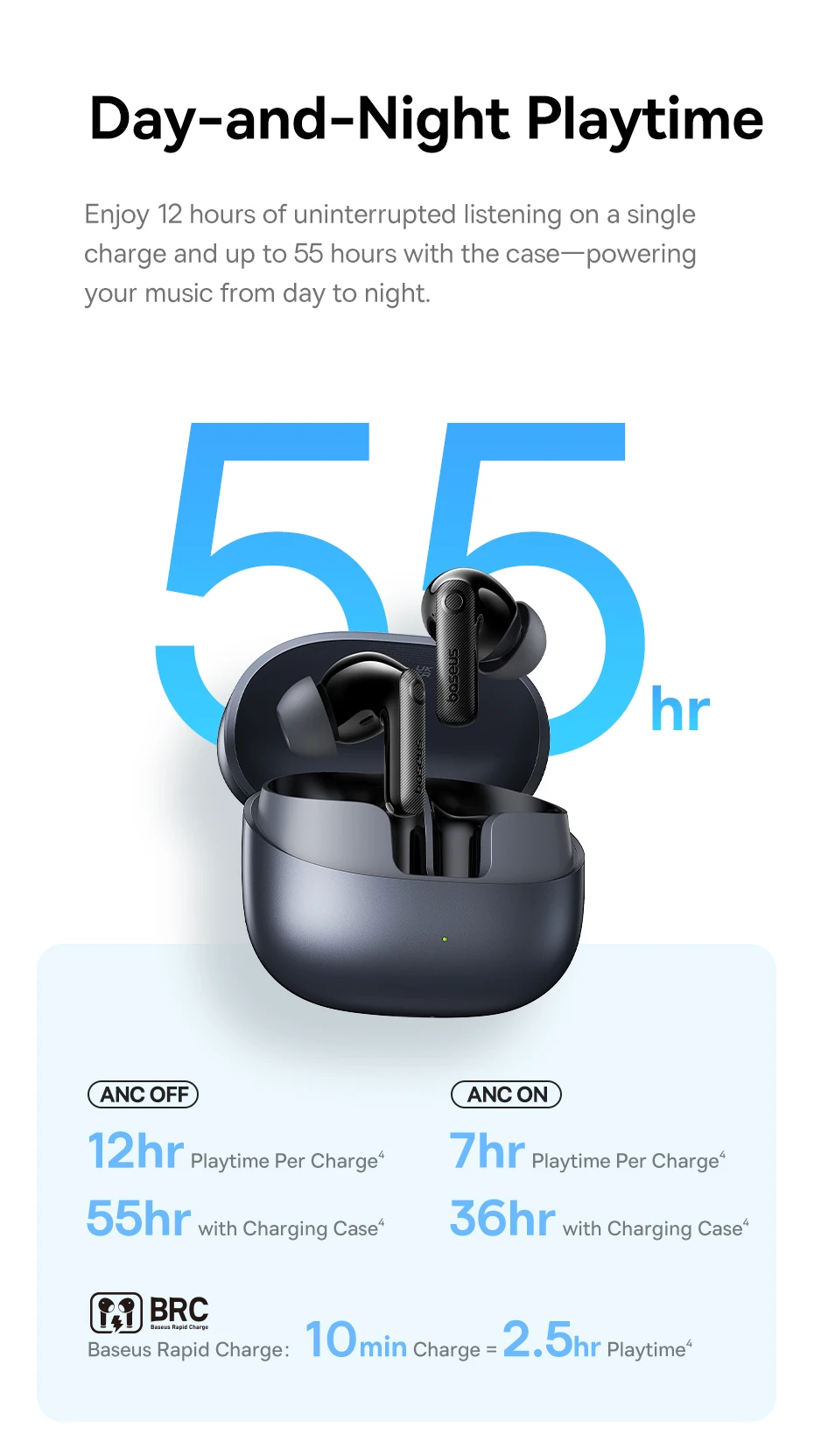 Bateria para o Dia Todo: Aproveite até 12h de uso contínuo (ou 55h com o estojo). Com apenas 10 min de carga, ganhe 2,5h de reprodução: