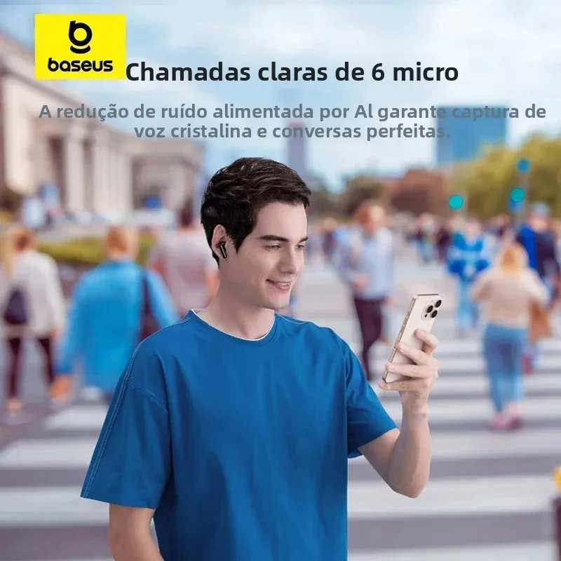 Chamadas Claras com 6 Microfones AI: Os fones Baseus EP10 Pro utilizam 6 microfones com tecnologia de redução de ruído alimentada por IA, garantindo captação de voz nítida e conversas sem interferências: