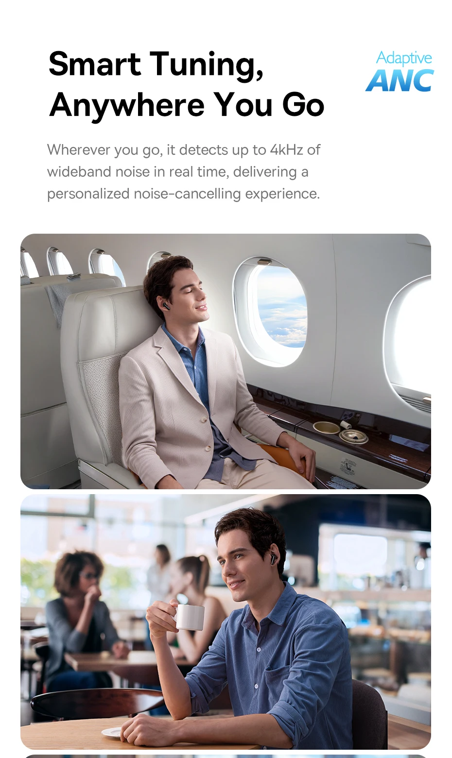 Ajuste Inteligente em Qualquer Lugar: O cancelamento de ruído adaptativo detecta até 4kHz de ruídos em tempo real, oferecendo uma experiência personalizada e eficaz — esteja você no avião, no café ou em movimento: