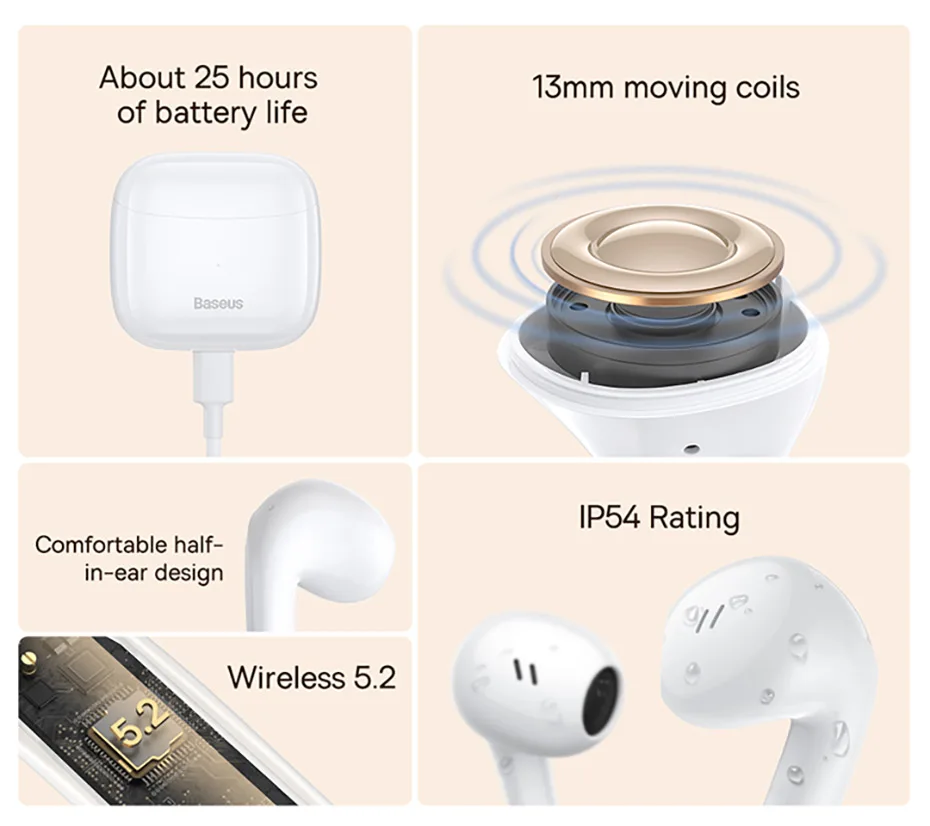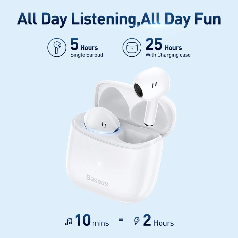 Bateria de longa duração: O fone de ouvido Baseus pode chegar até 5 horas de uso sem carregamento, considerando a bateria do case, esse tempo pode chegar a até 25 horas: