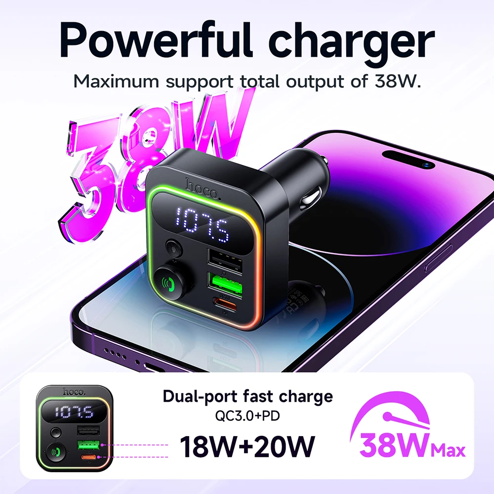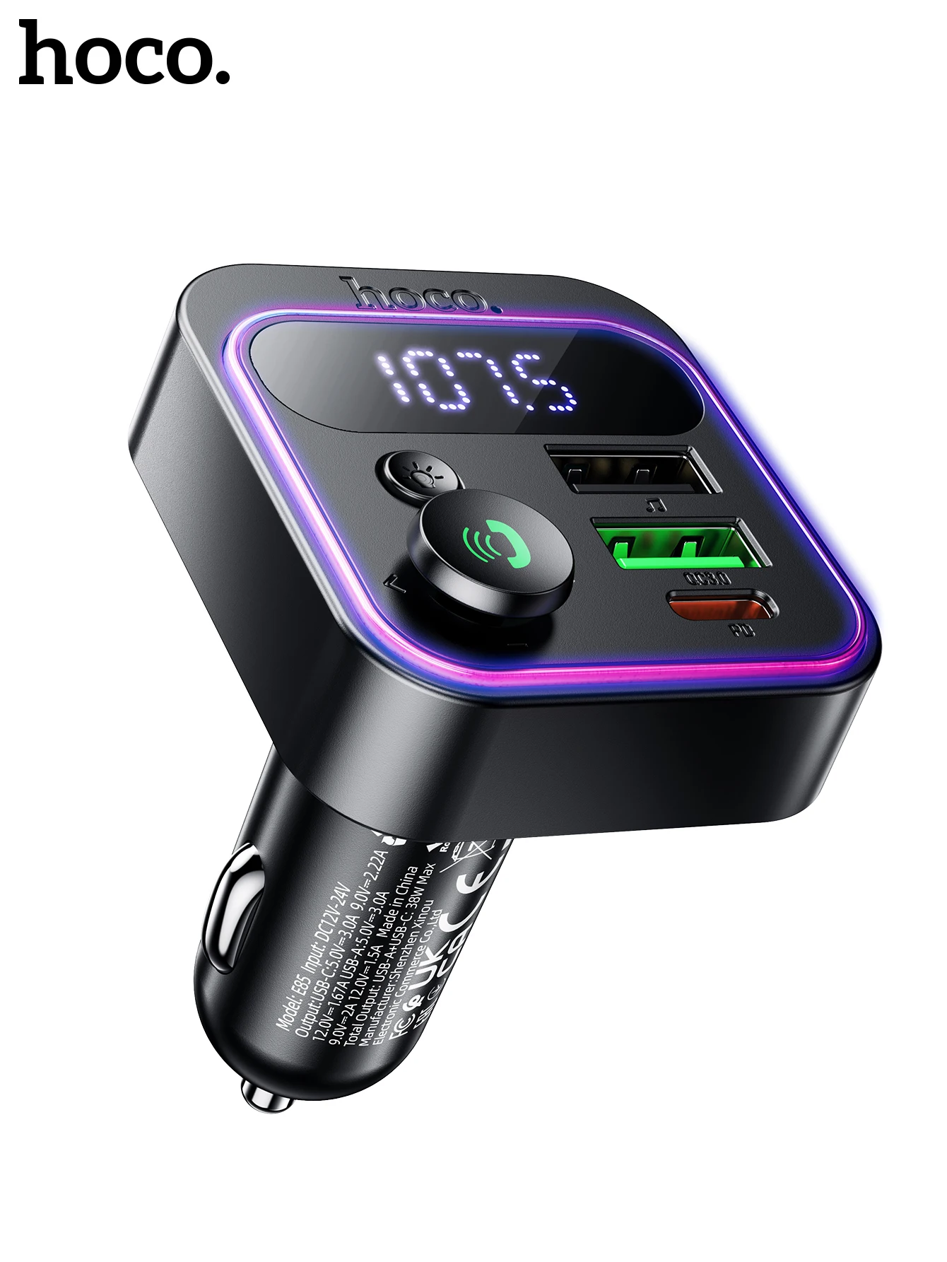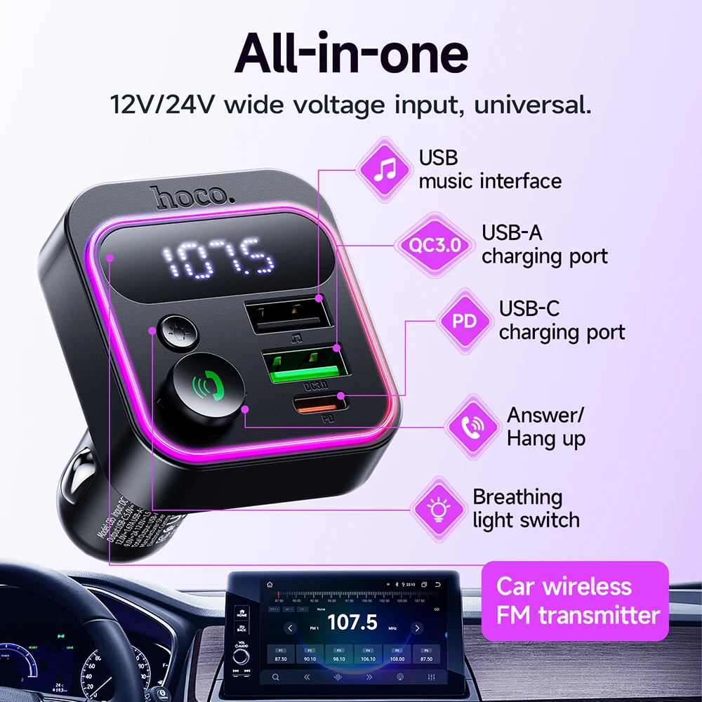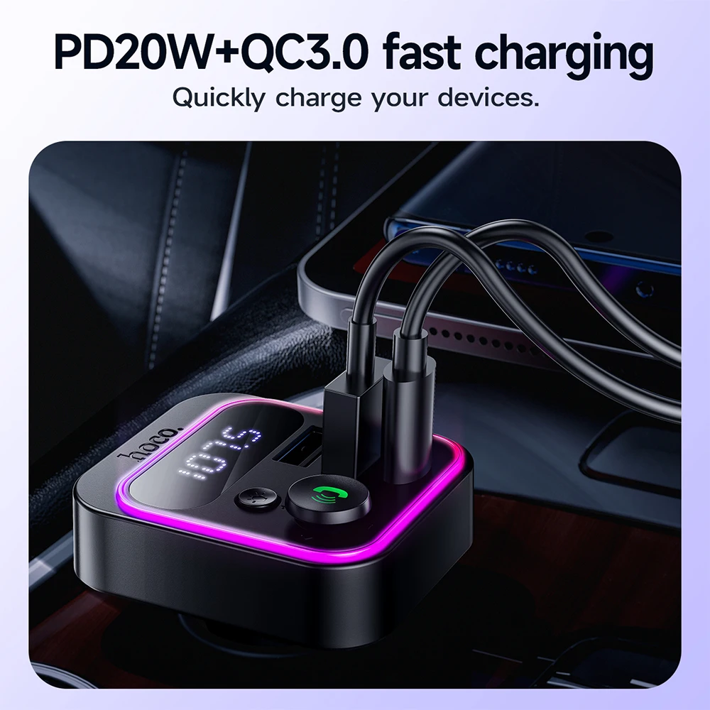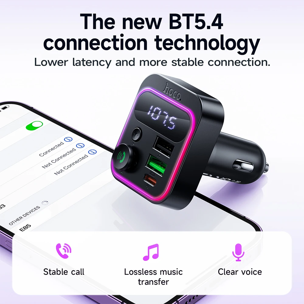 HOCO E85 Transmissor FM Veicular Bluetooth 5.4 com PD20W e QC3.0