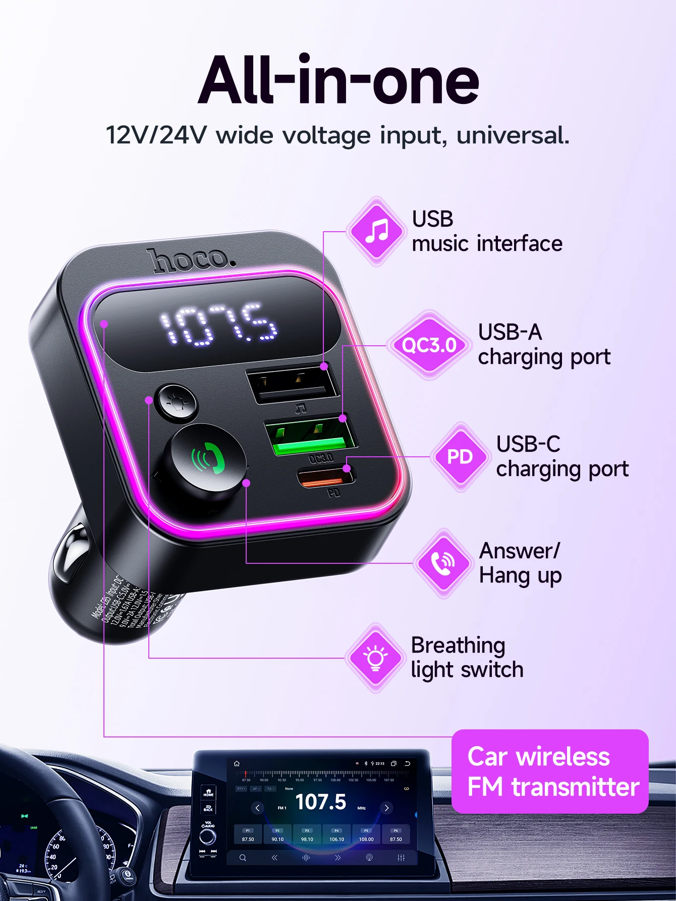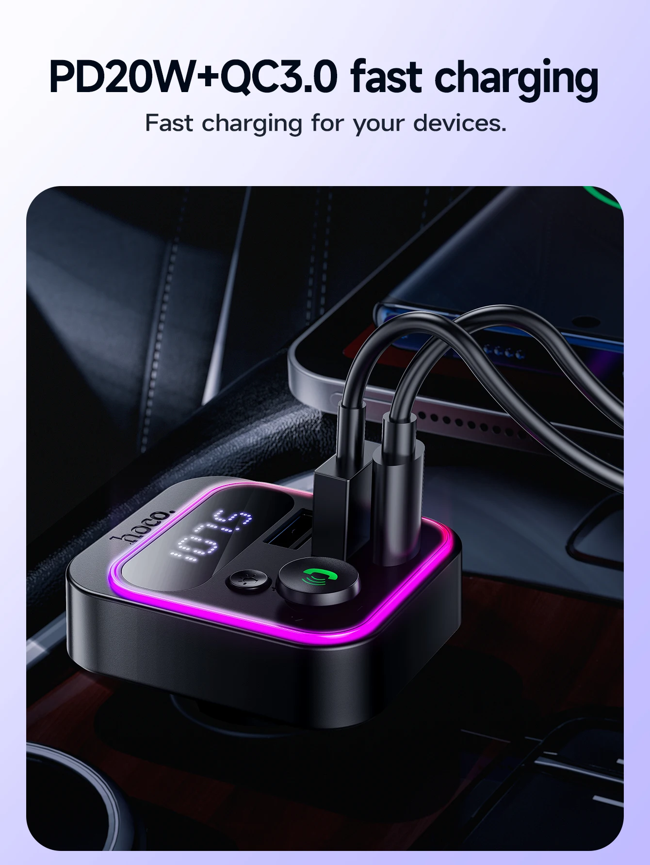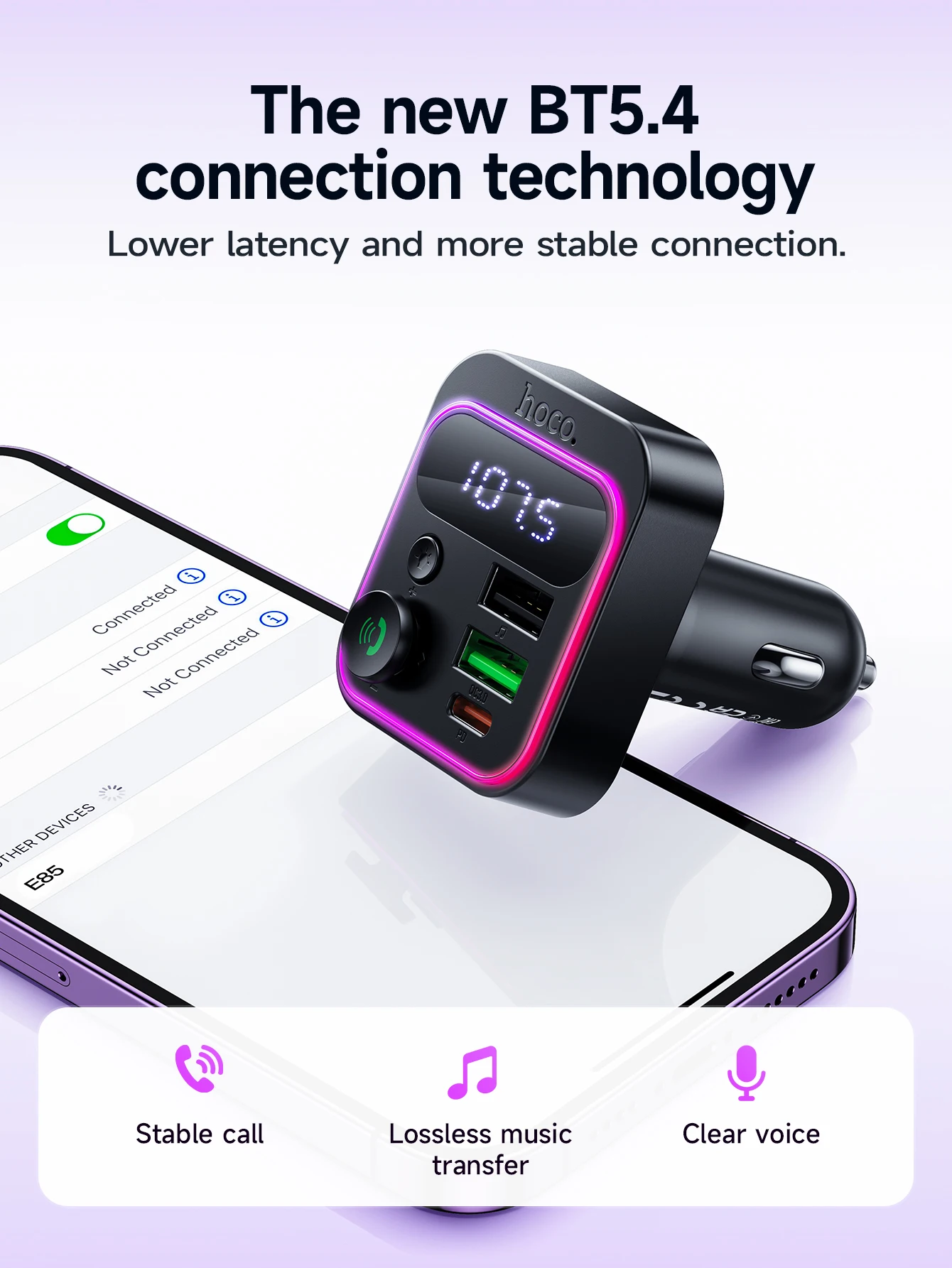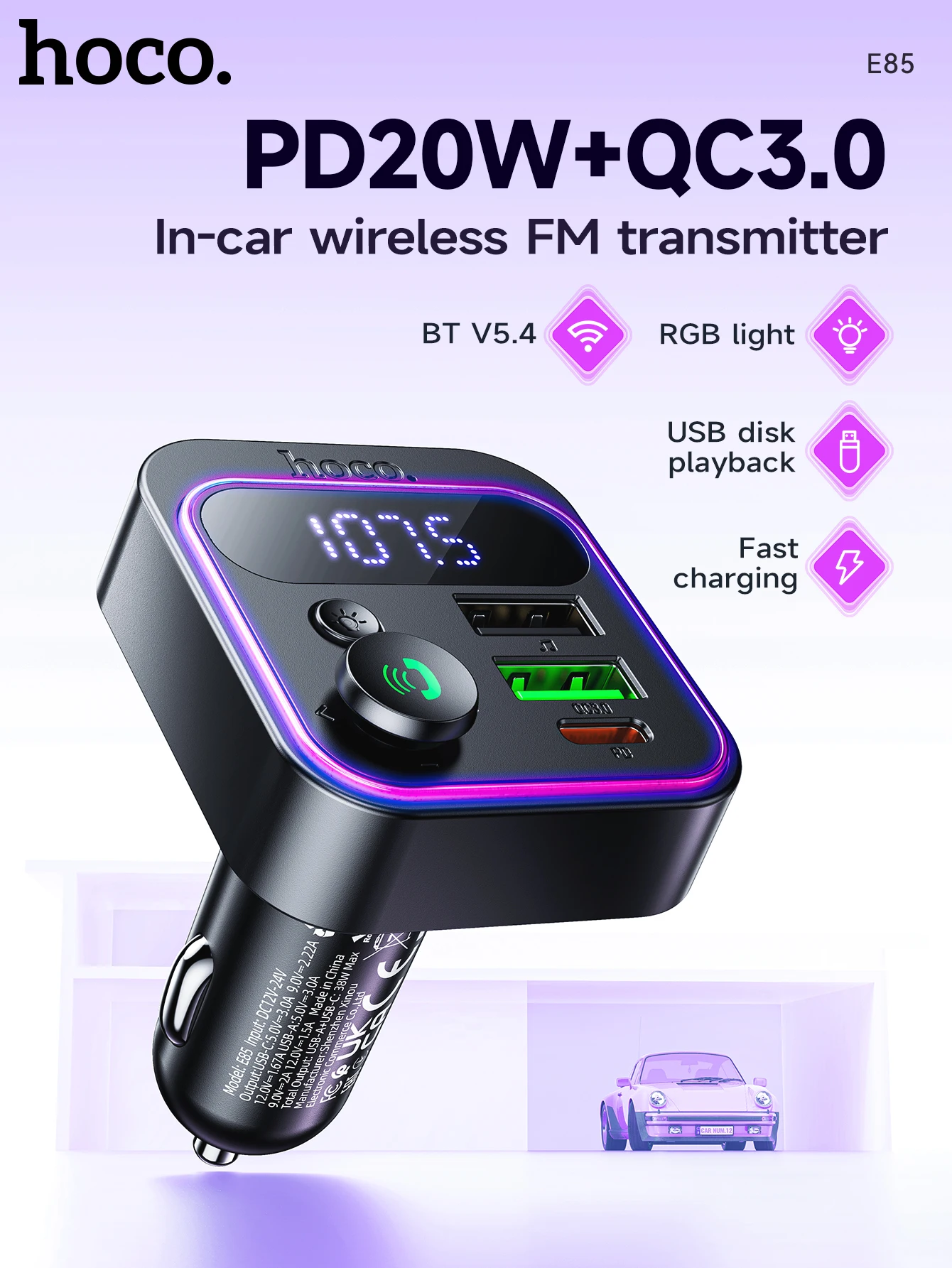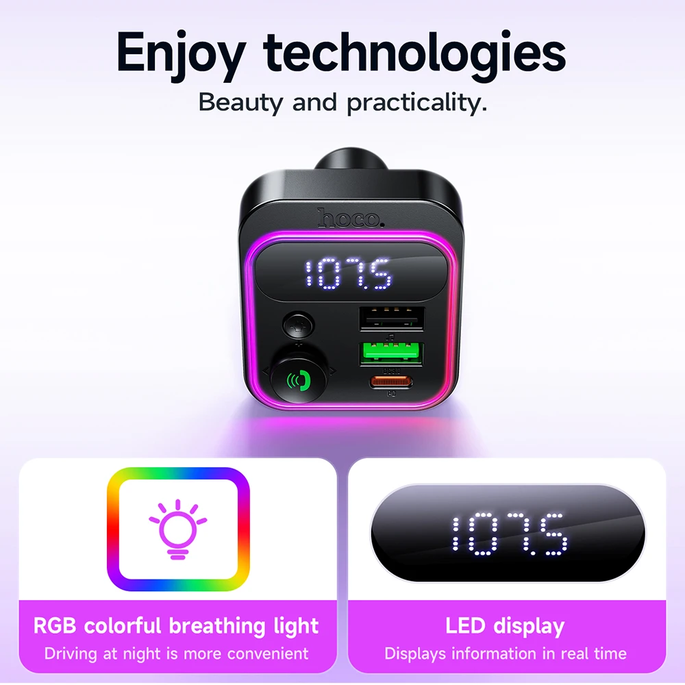 HOCO E85 Transmissor FM Veicular Bluetooth 5.4 com PD20W e QC3.0