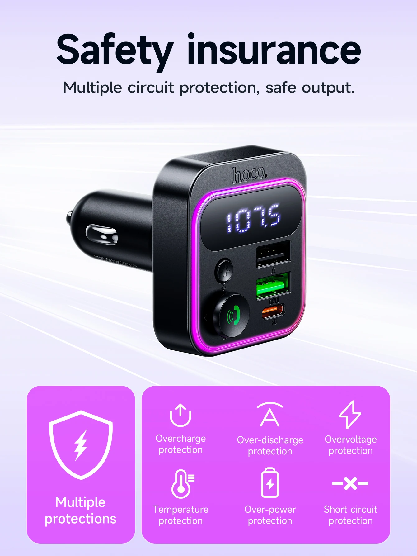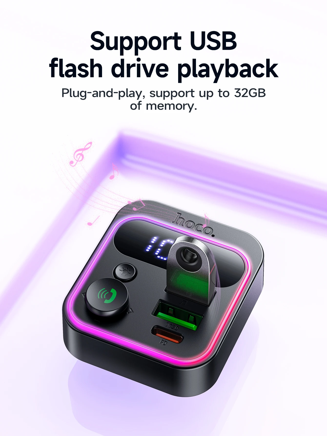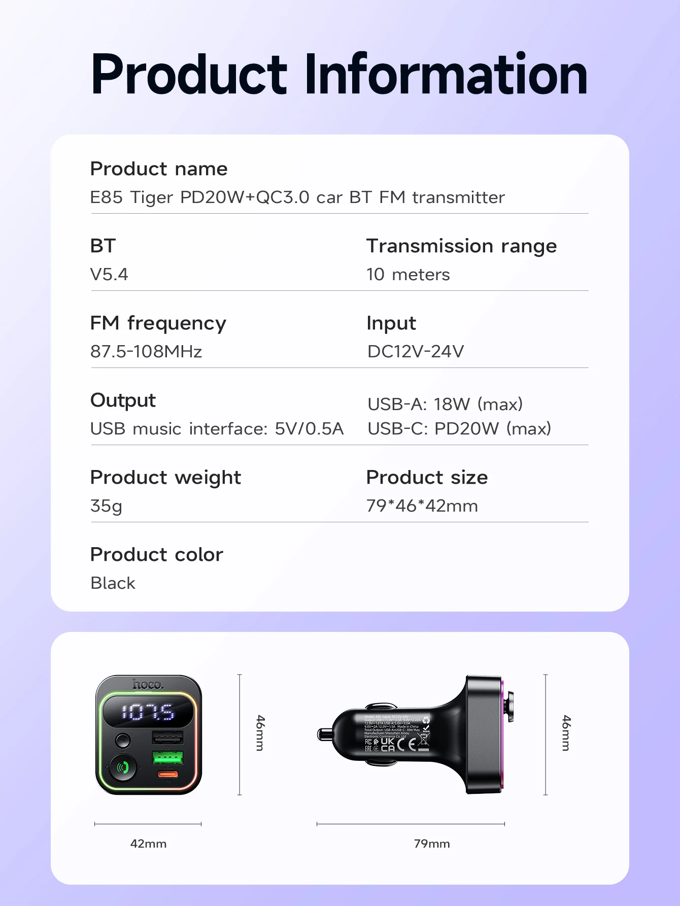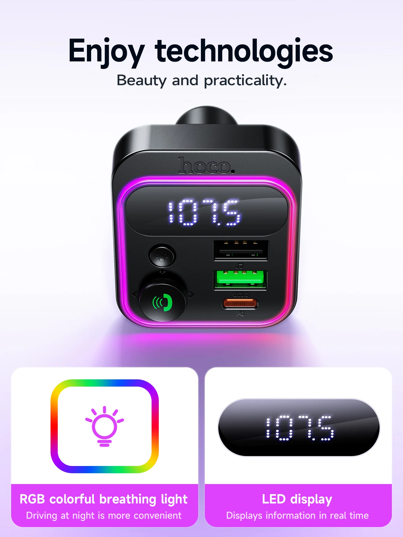 HOCO E85 Transmissor FM Veicular Bluetooth 5.4 com PD20W e QC3.0