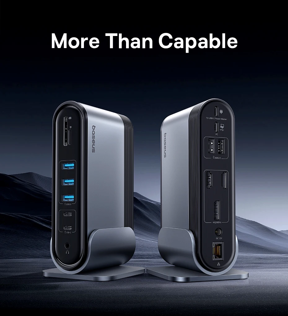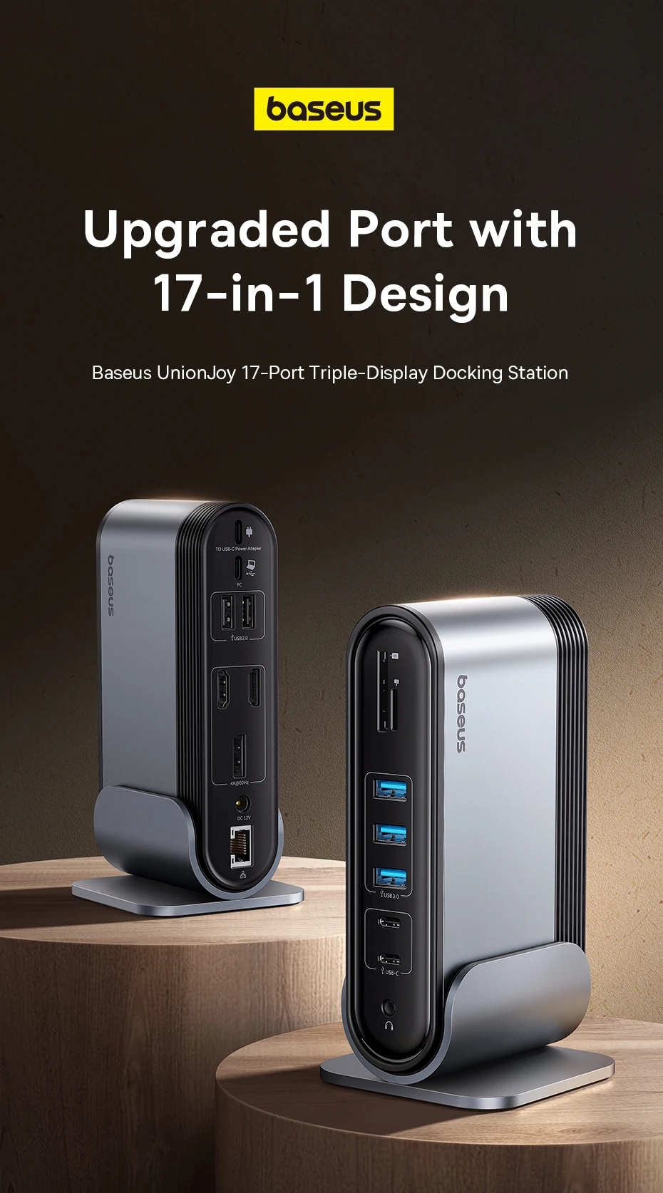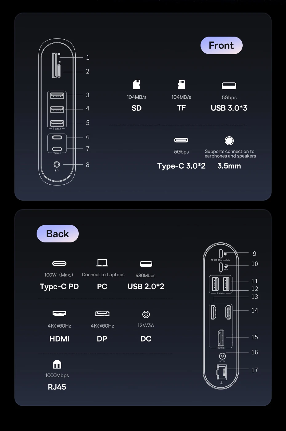 Portas disponíveis nos dois lados do HUB: Construído com 17 opções de conexão, se diferindo da versão 16 em 1 pela existência de 3 portas HDMI 4k HD em vez de 1 HDMI e 1 VGA: