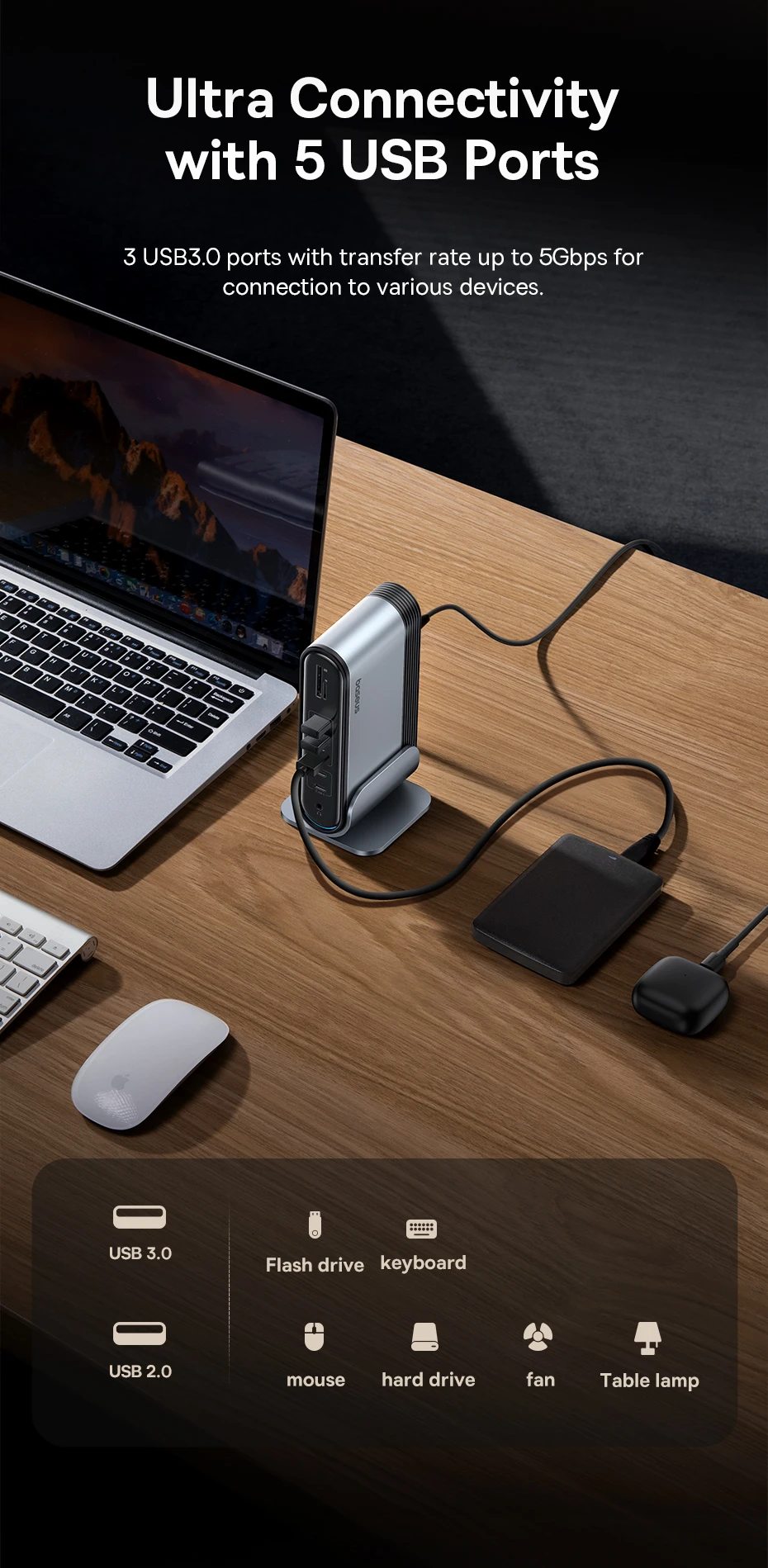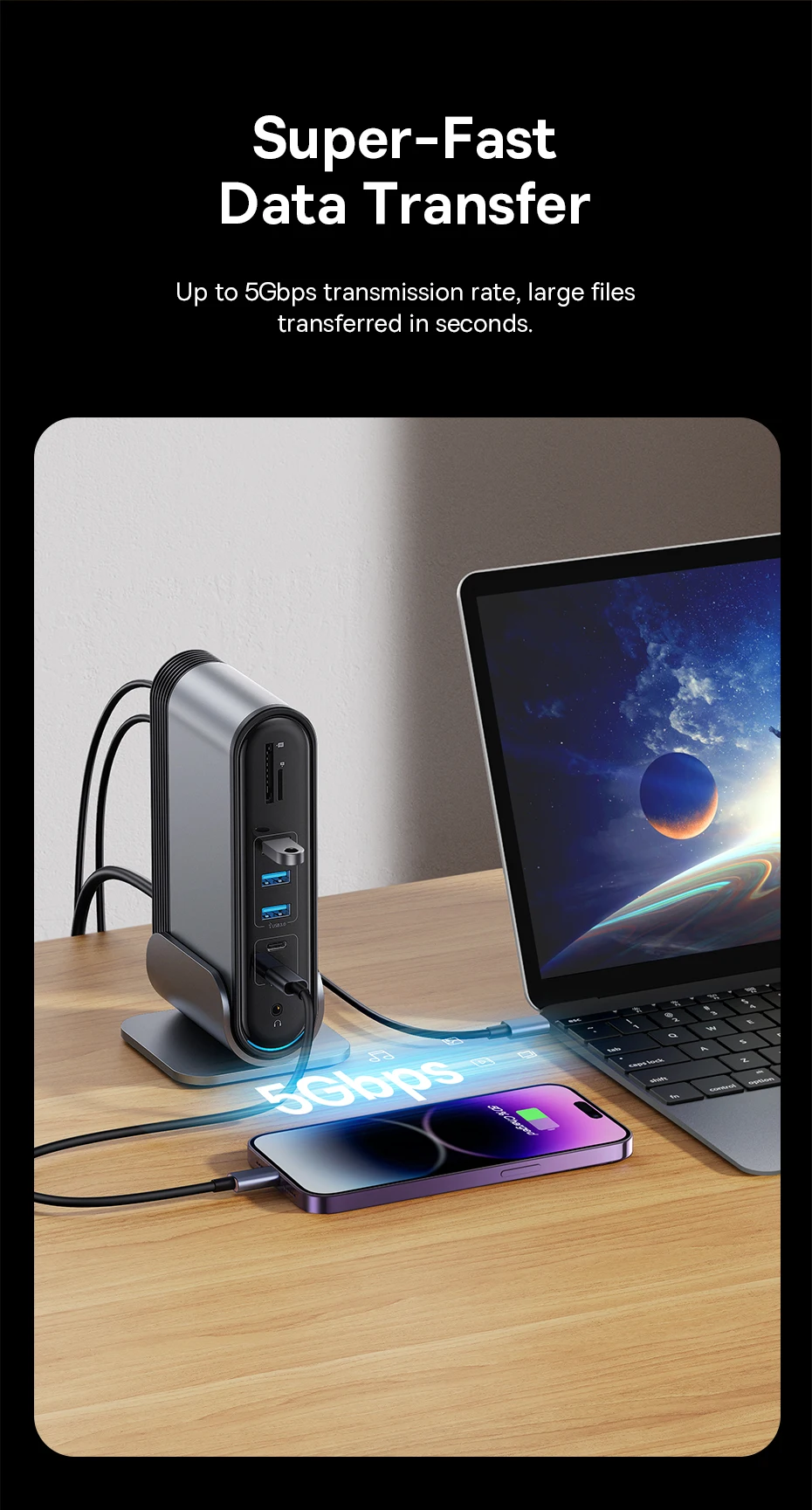 5 entradas USB: O HUB Baseus possui 5 interfaces USB independentes, que podem atender às necessidades de vários dispositivos ao mesmo tempo. Com velocidade de transmissão USB 3.0 de até 5 Gbps, que pode acionar dois discos rígidos de 4T ao mesmo tempo: