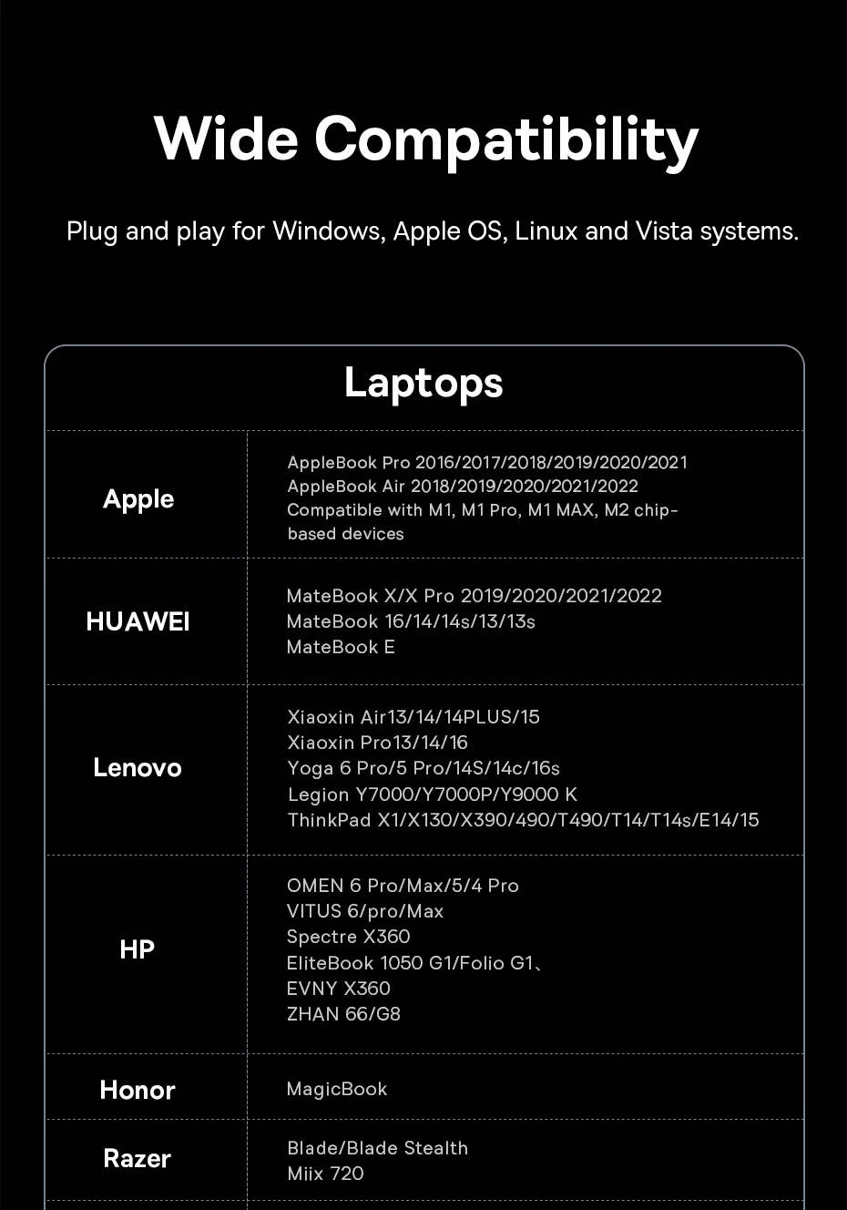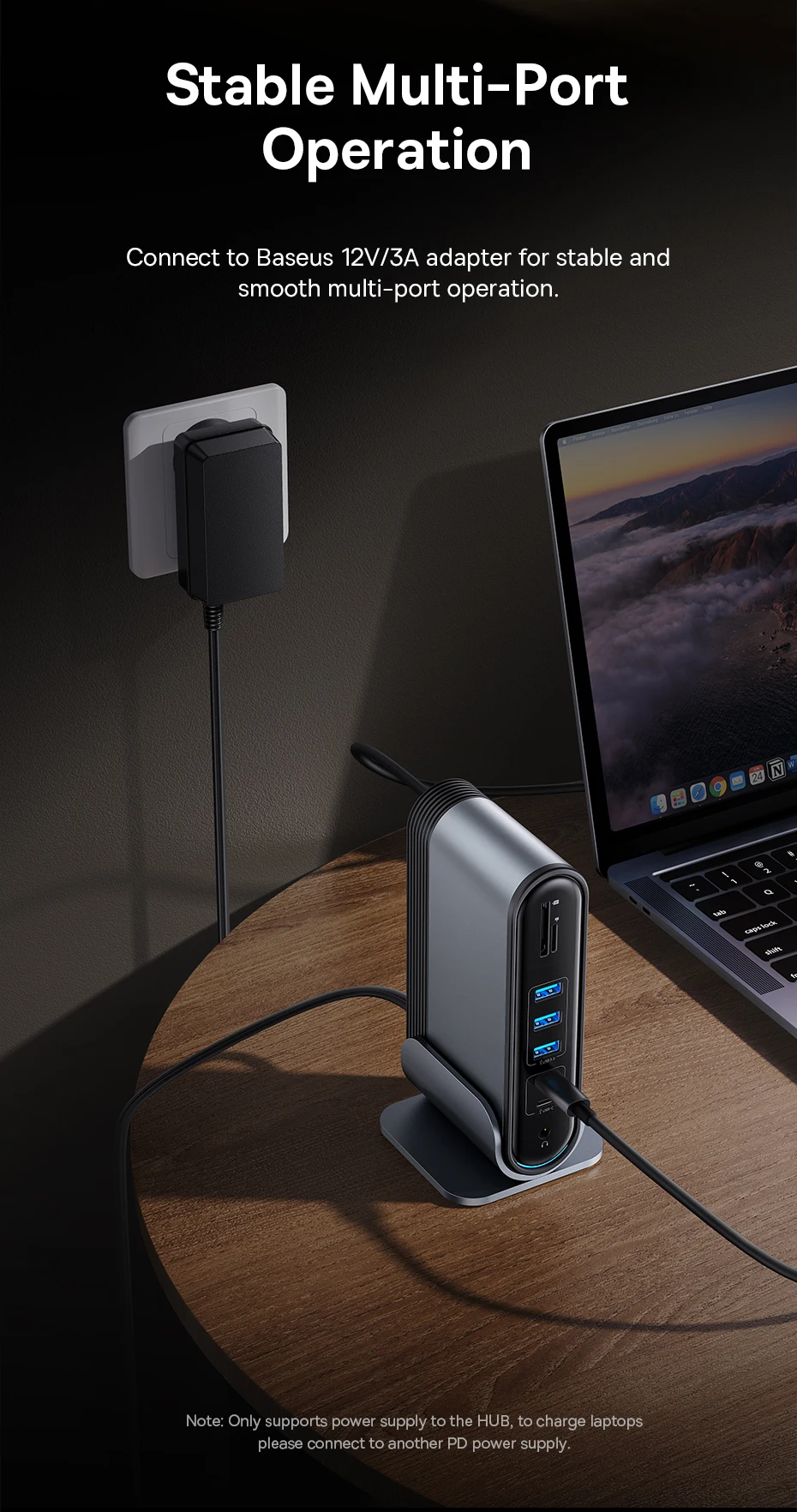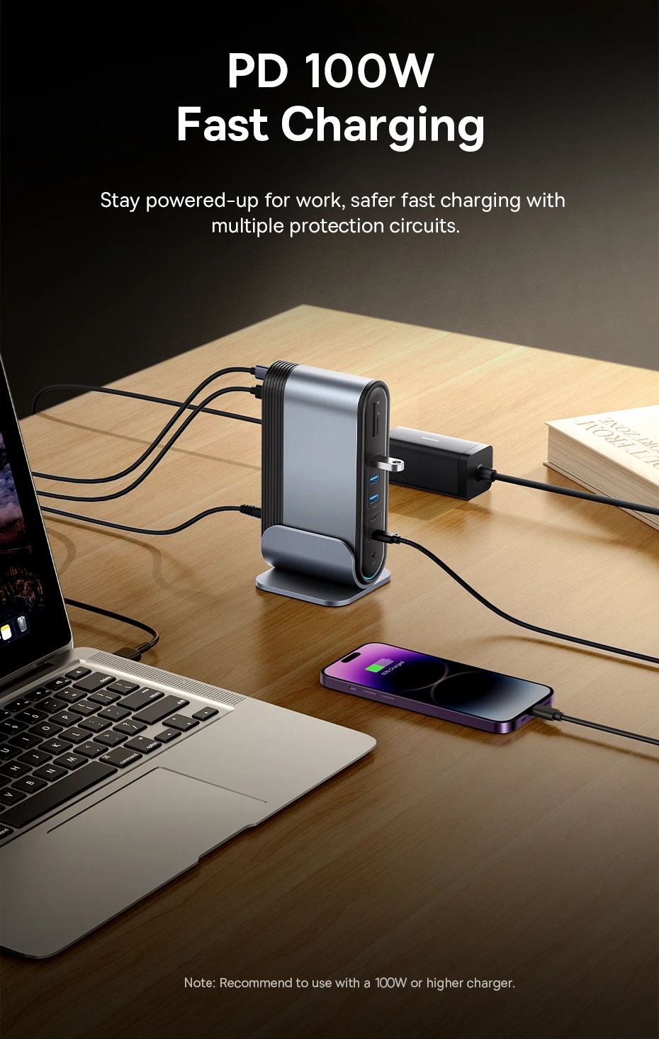 Entrada PD de 100W: Possui uma porta de alimentação adicional para o seu computador para evitar quedas de energia em seu escritório. Suporta carregamento de alta potência PD 100W (Max):