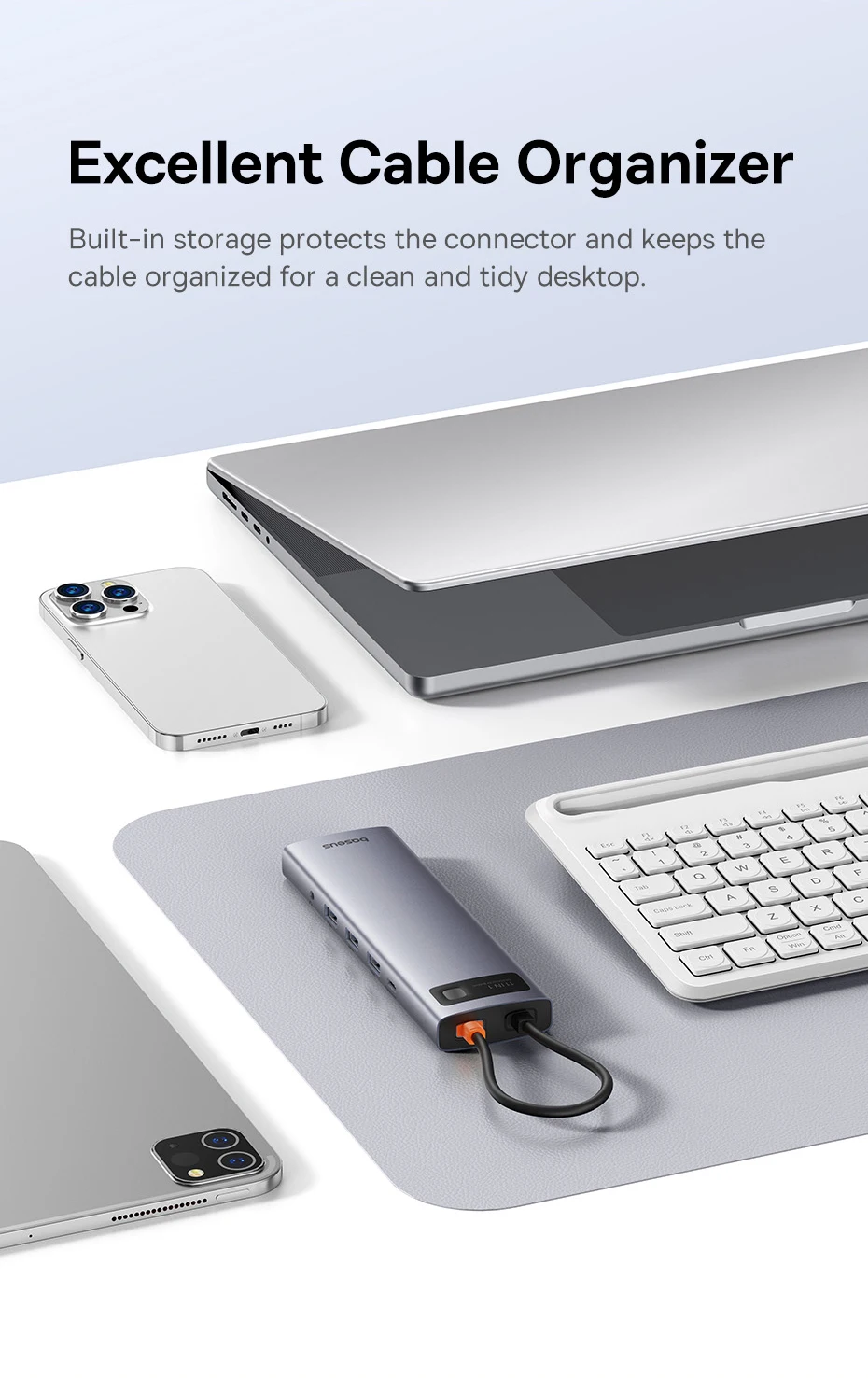 Organização do Cabo: Armazena o conector e mantém a mesa limpa e organizada:
