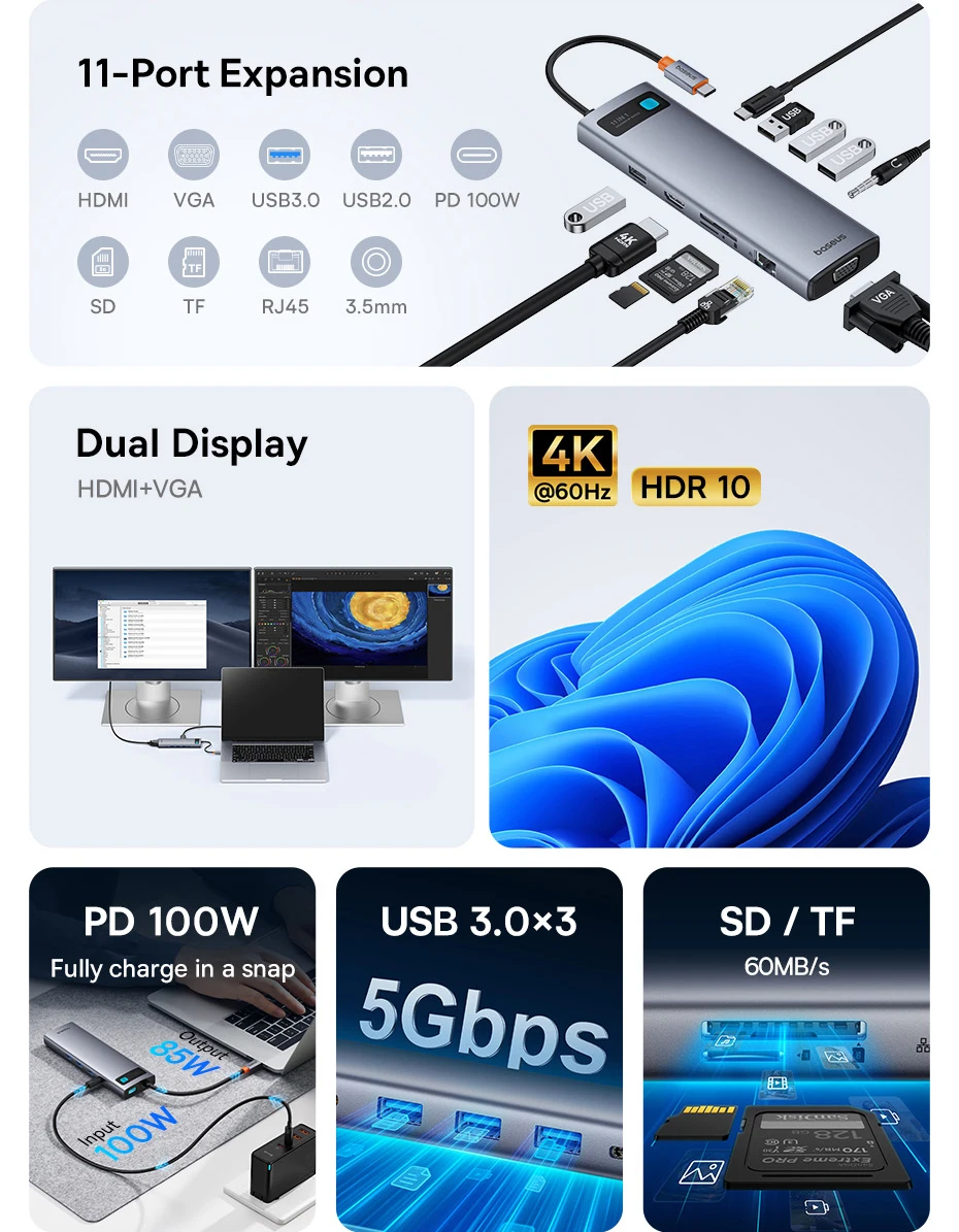 Hub USB C 11 em 1 Baseus 4K 60Hz Atualizado: Novo e Atualizado: