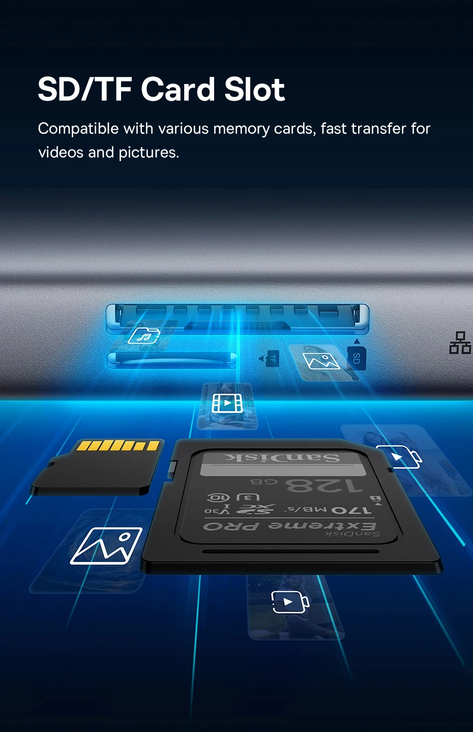 Entrada para Cartão SD/TF: Compatível com diversos cartões. Transferência rápida de fotos e vídeos: