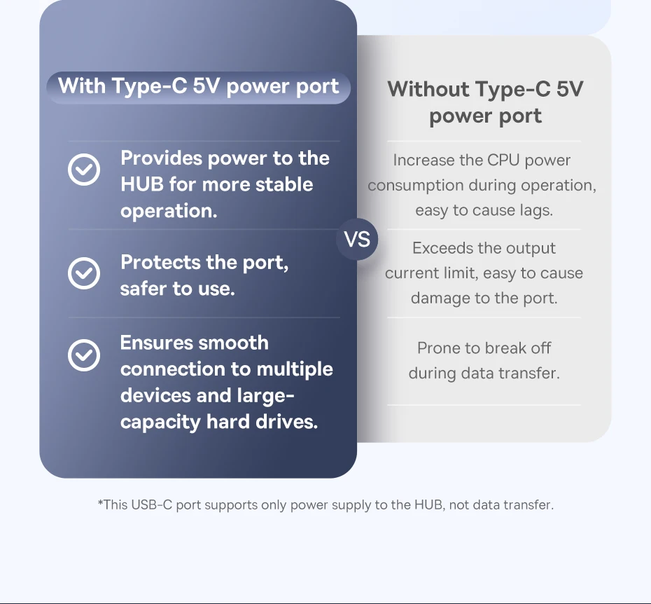 Porta USB C de 5V: Melhora a estabilidade do Hub e permite conexão de Discos Rígidos de até 22TB: