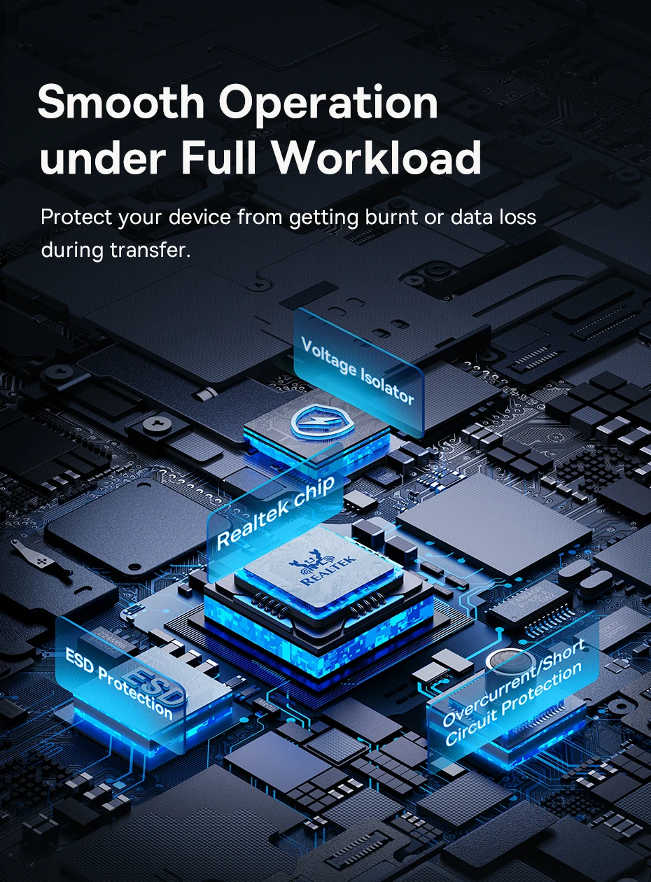 Operação Estável e Segura: Equipado com chip Realtek e proteção contra sobretensão, curto-circuito e descargas eletrostáticas, garante desempenho confiável mesmo sob carga total: