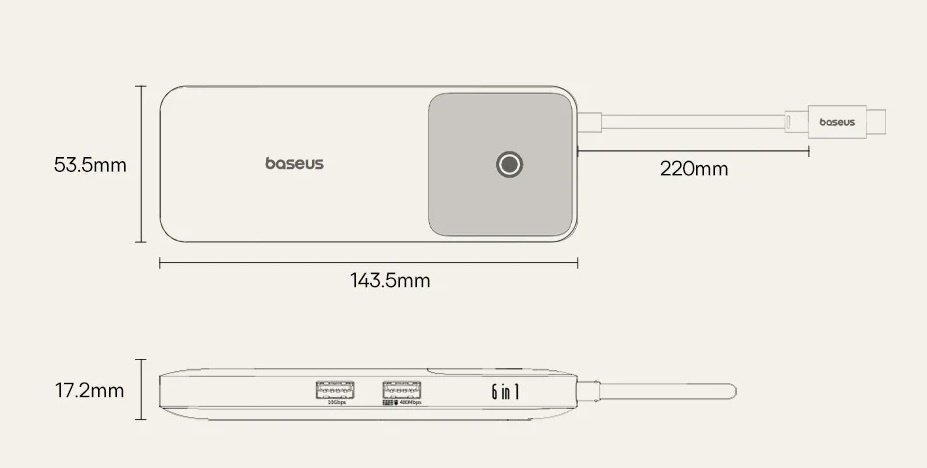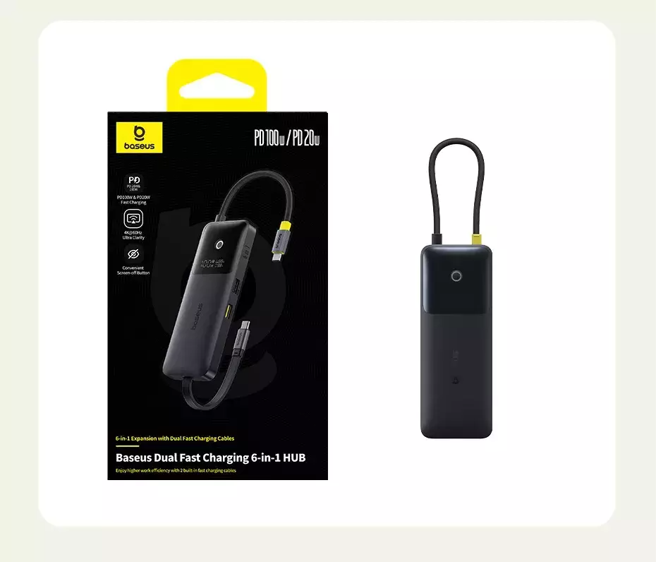 Expansão Potente com Cabos Duplos: Hub Baseus 6 em 1 com carregamento duplo rápido, oferecendo expansão eficiente e prática para conectar e carregar seus dispositivos ao mesmo tempo: