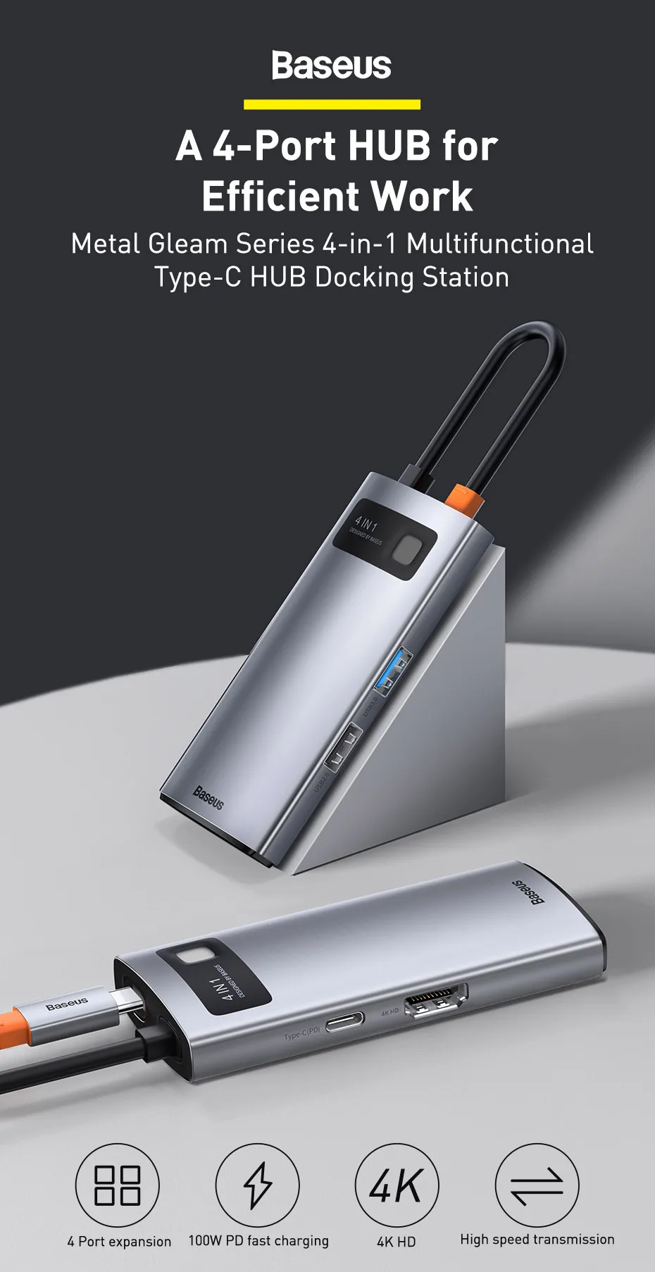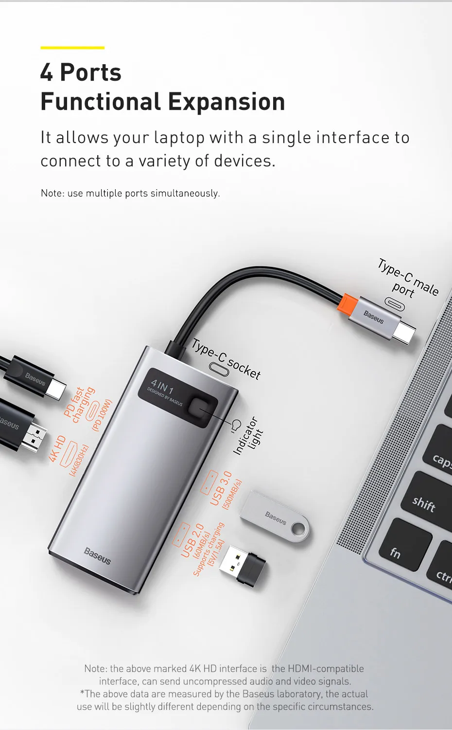 Alta Potência de Saída: O HUB USB C 9/11 em 1 Baseus suporta a função de carregamento rápido mesmo com o dispositivo em funcionamento devido a sua alta carga de saída de 100W em portas Tipo-C: