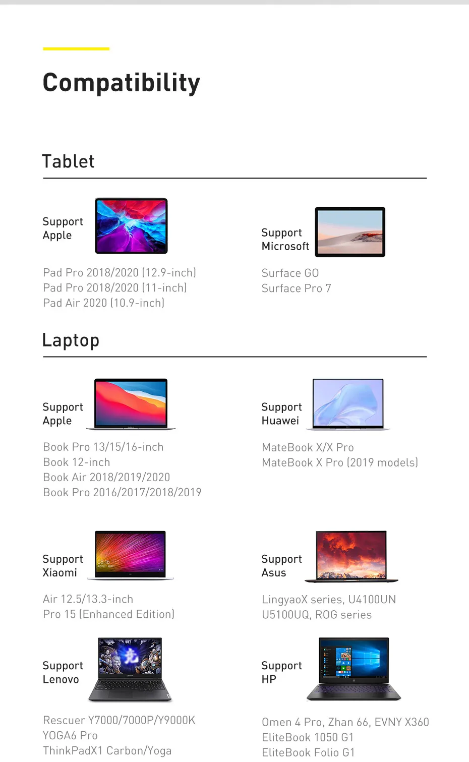 Suporta Protocolos de Carga Rápida: O Hub Baseus foi projetado para suportar os protocolos de carga rápida atuais, funcionando sem perda de qualidade em múltiplos dispositivos:
