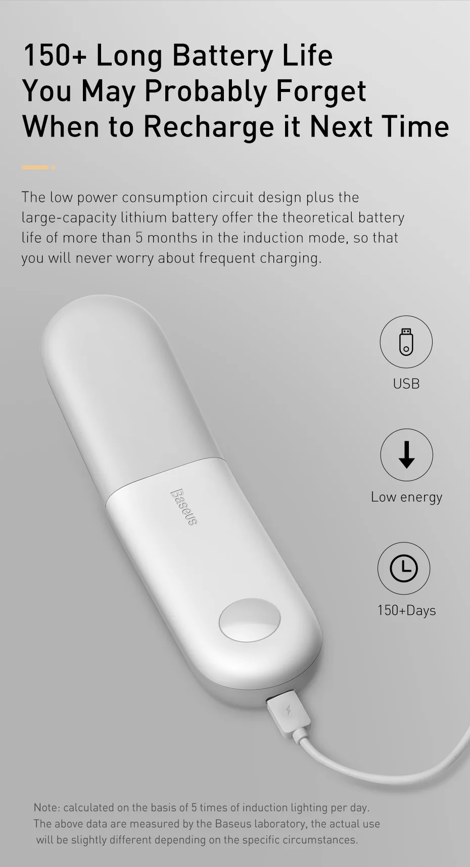Baixo consumo e alta resistência: É uma lâmpada de baixo consumo de energia com duração de mais de 150 dias, o carregamento é feito por uma entrada USB C: