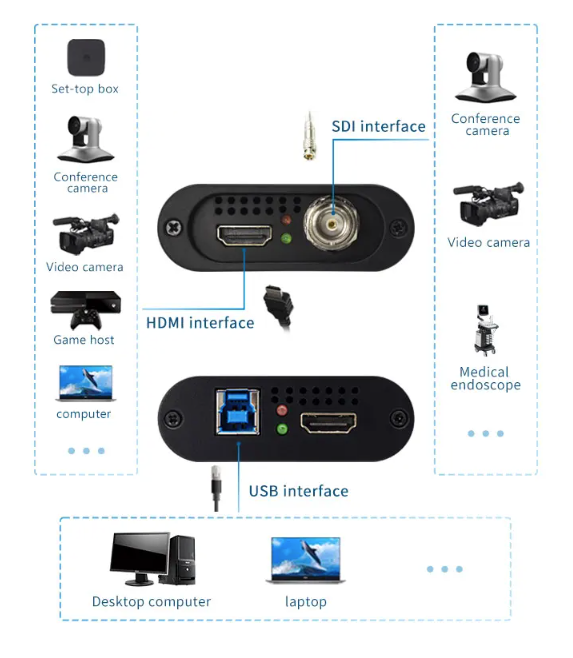 Coleta Simultânea via Dupla Interface: Capture dois sinais de vídeo ao mesmo tempo com entradas HDMI e SDI. Compatível com câmeras, videogames, decodificadores, computadores e equipamentos médicos. Conecte-se facilmente ao seu desktop ou laptop via USB: