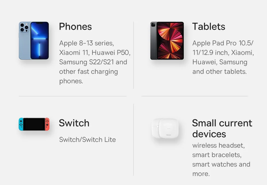 Compatível com diversas marcas e modelos: O Power Bank Baseus suporta as tecnologias de carregamento rápido de diversas marcas e modelos, podendo ser utilizado em laptops, smartphones, tablets, fones de ouvido, etc:
