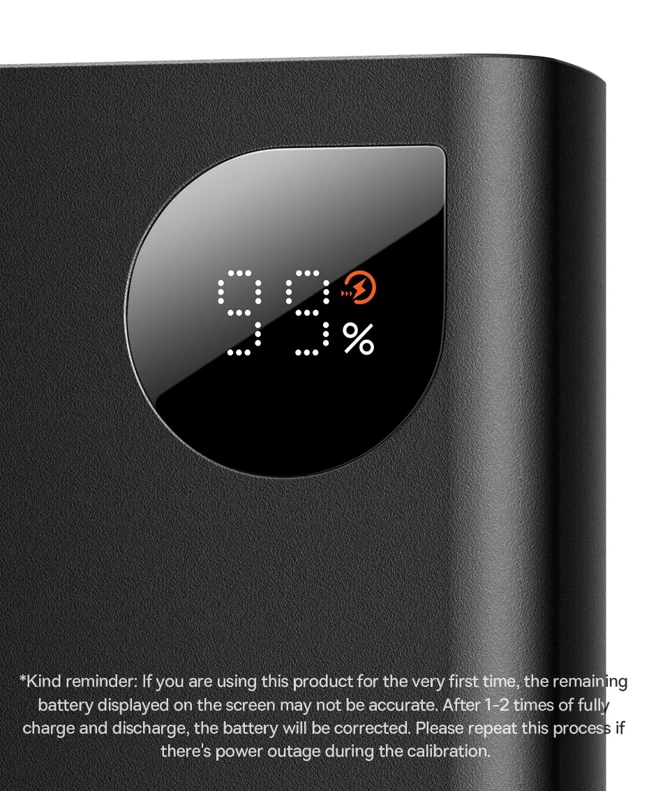 Display digital em LED: O Power Bank 30W Baseus vem construído com um display digital em LED com informações do nível de bateria e o modo de carga: