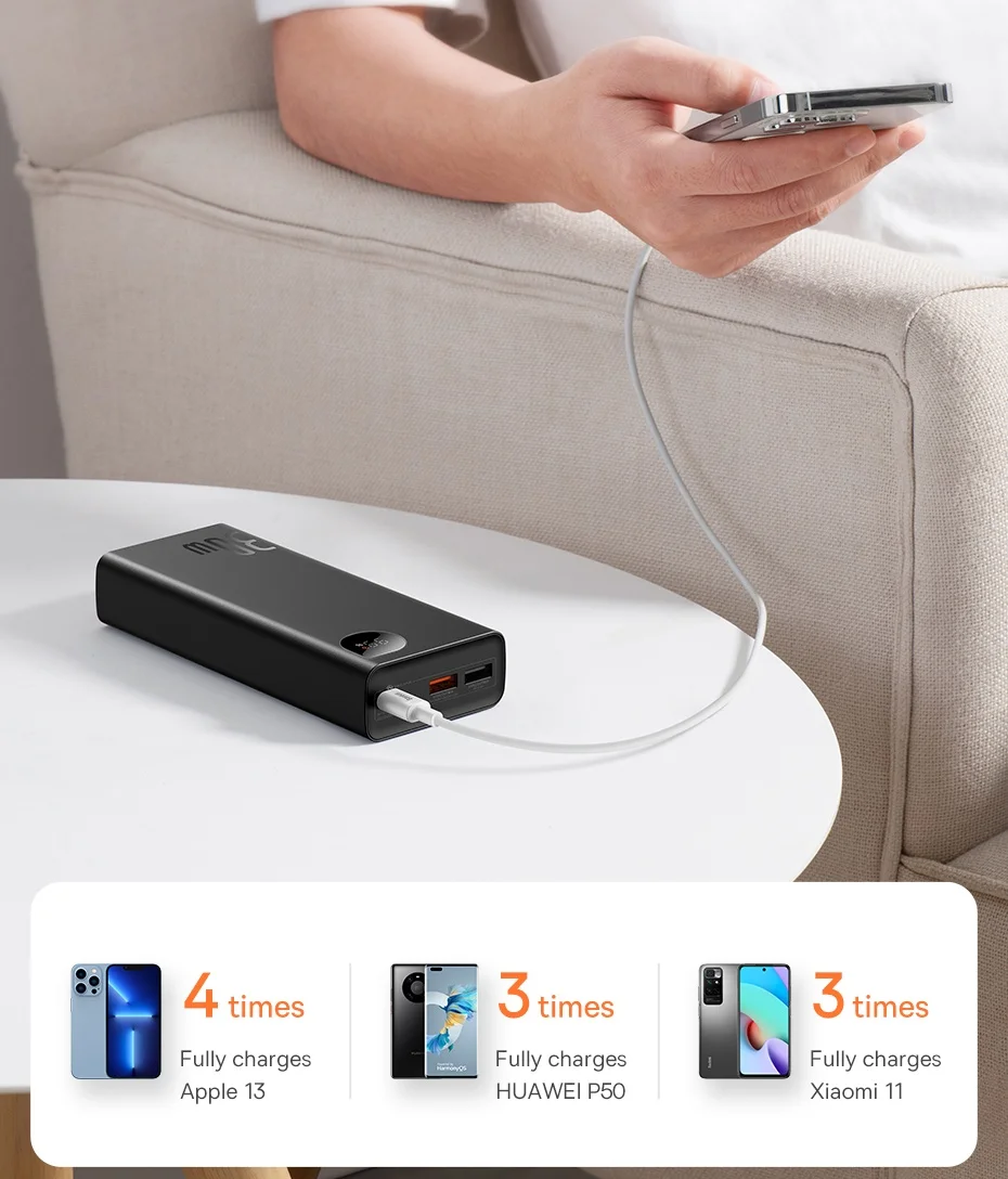 Carregamento rápido: O Power Bank 30W 20000mAh Baseus possui uma alta velocidade de carregamento de dispositivos móveis devido aos seus 30W de potência de saída, chegando a carregar 100% de um iPhone 13 Pro Max em 1 hora e meia: