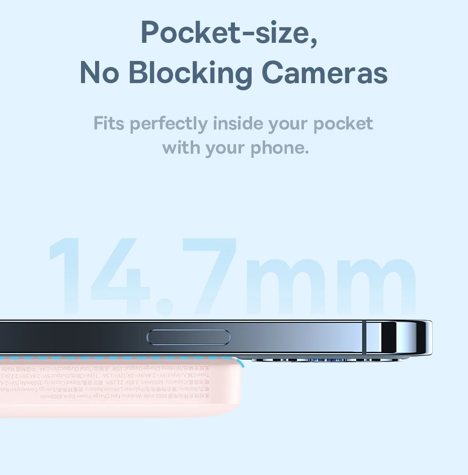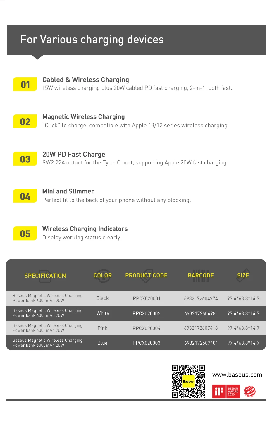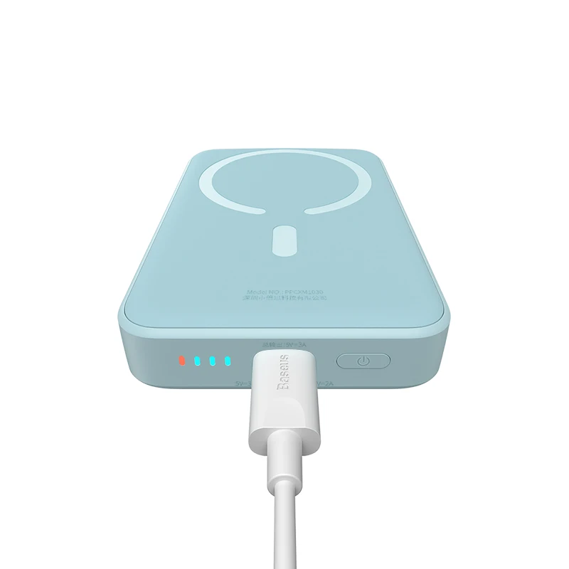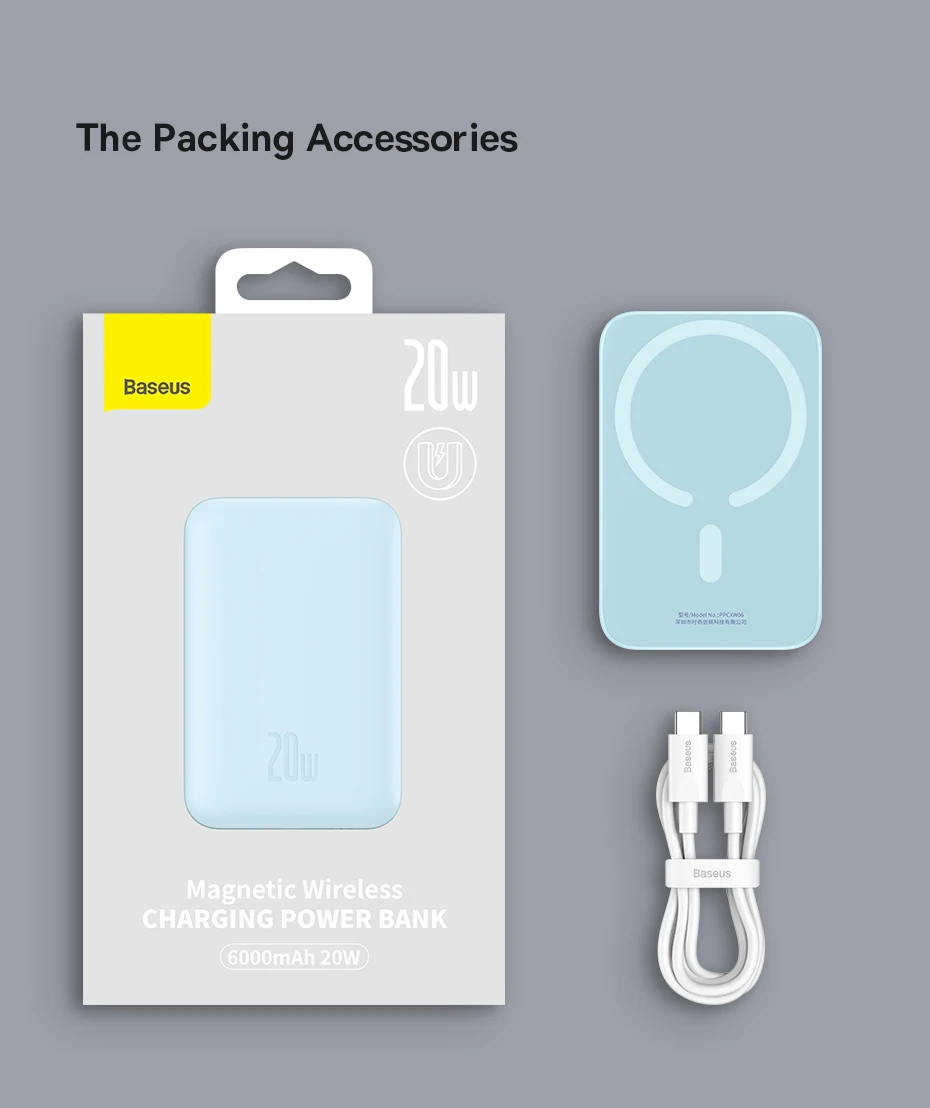 Carregamento Com e Sem Fio: O Power Bank Magnético 20W 6000mAh Baseus funciona por indução nas potências de 15W/10W/7,5W e via cabo na potência de 20W, se adaptando as necessidades de vários dispositivos: