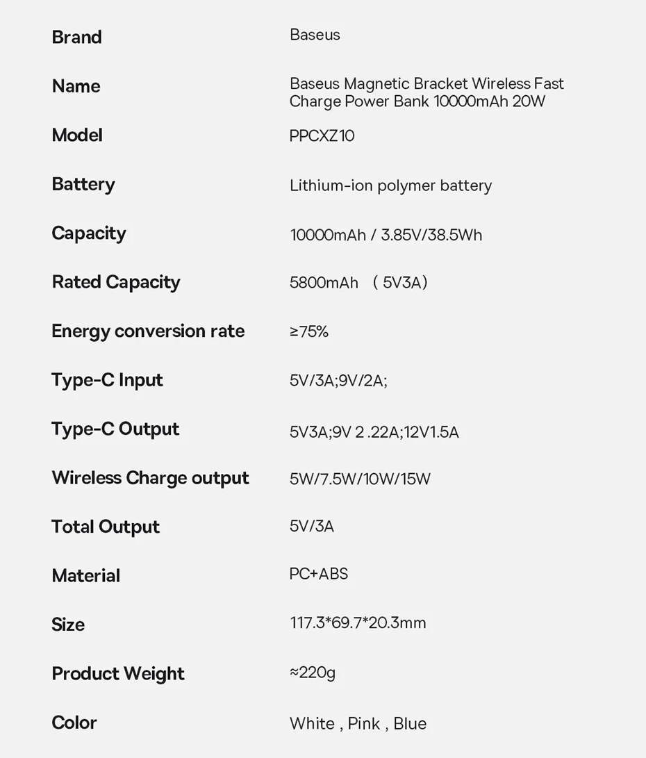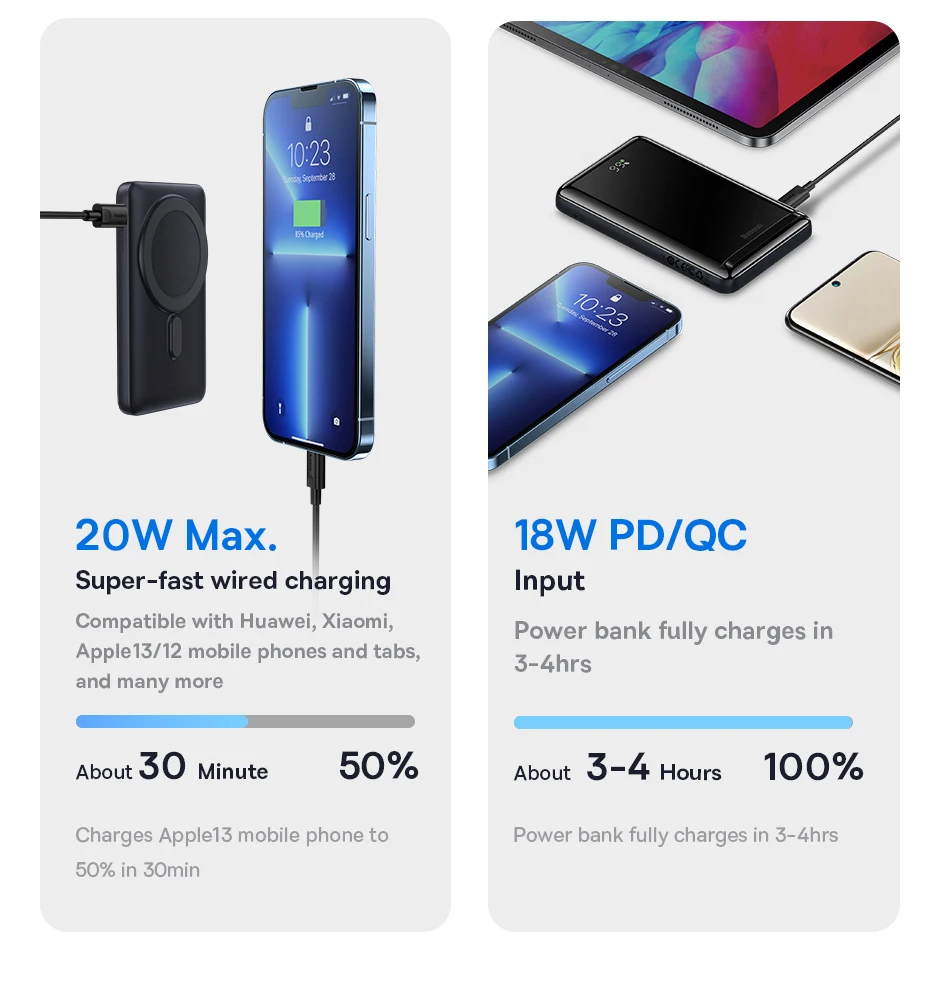 Carregamento Com Fio de 20W: Carregue 50% em 30min. O Power Bank tem carga completa em aproximadamente 3h:
