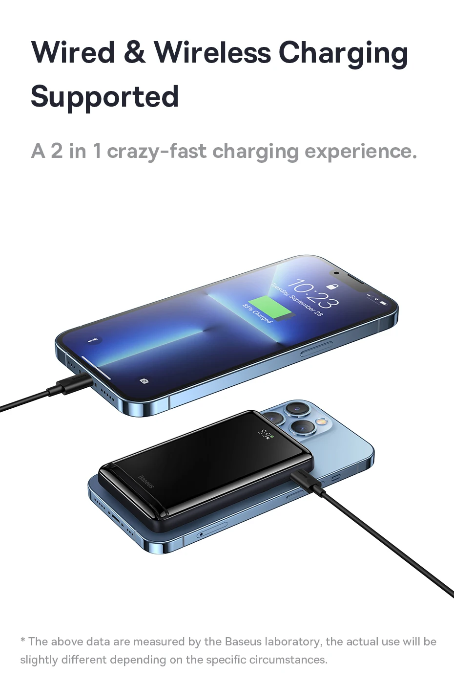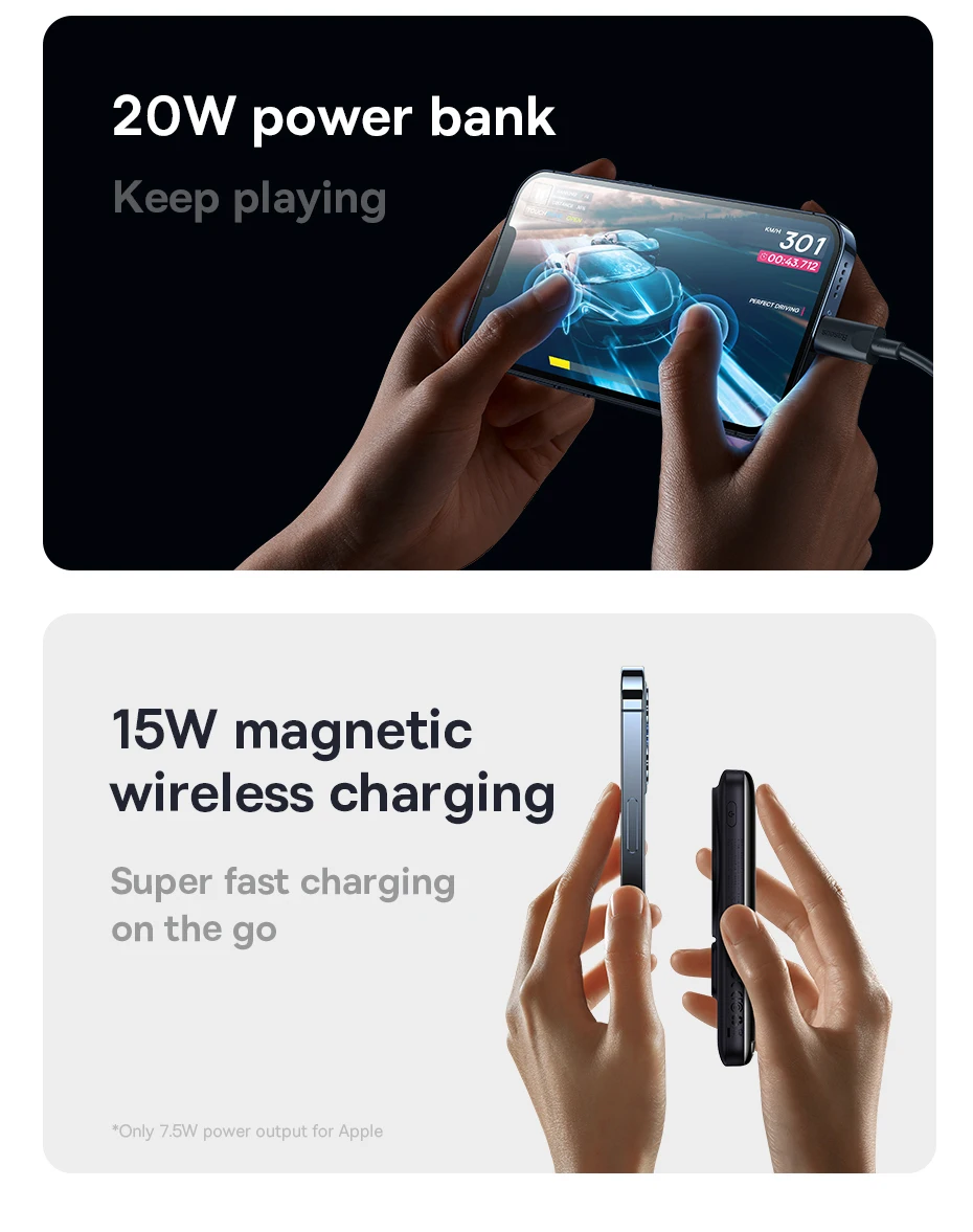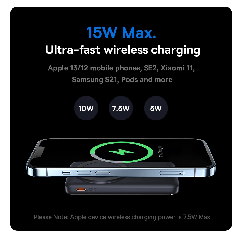 Use o carregamento sem fio para carregar seu iPhone (15W), e carregamento cabeado para carregar seu Power Bank (20W):